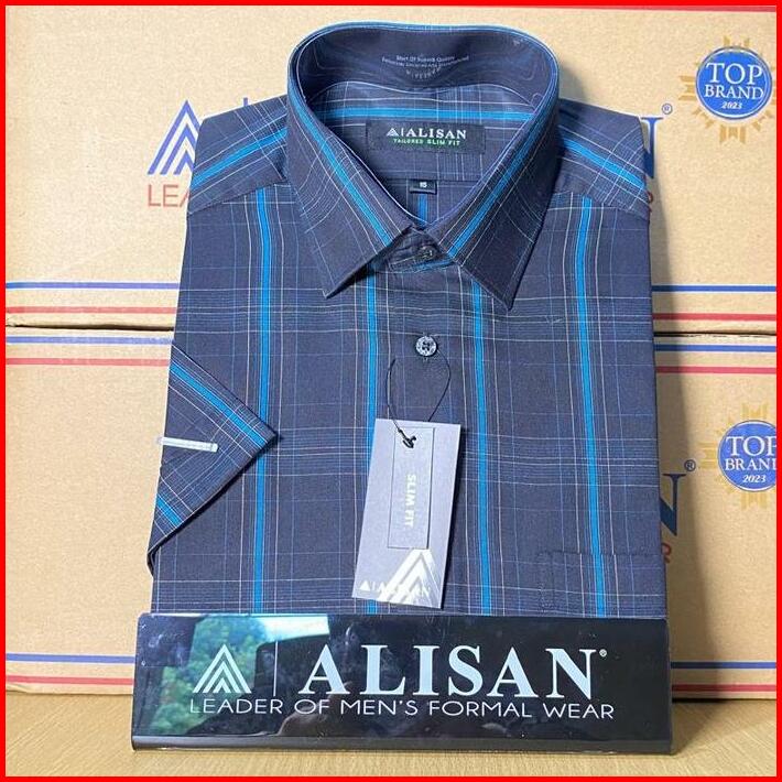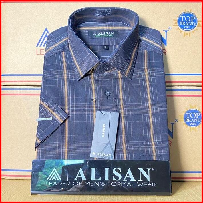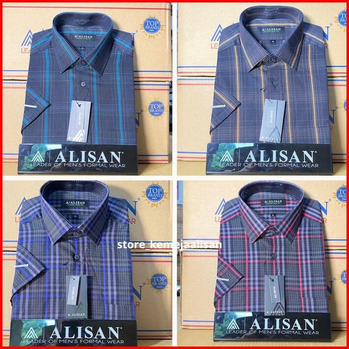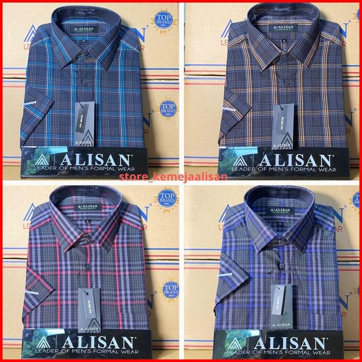 Kemeja Alisan Slimfit Lengan Pendek Motif Kotak Garis Hitam Tosca Biru Merah Coklat