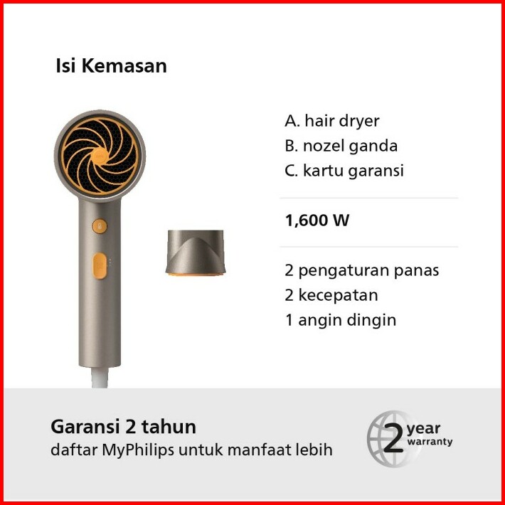 Philips Hair Dryer 3000 Pengering Rambut 30 Juta Ion Untuk Rambut Halus Dan Berkilau Abu-abu Metalik Bhd321 00