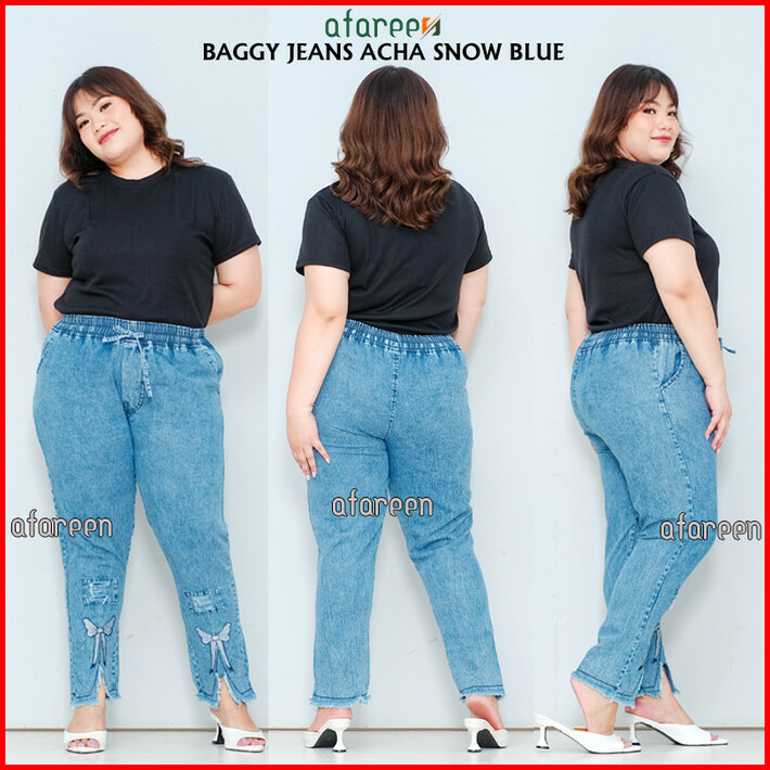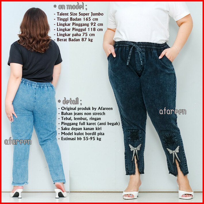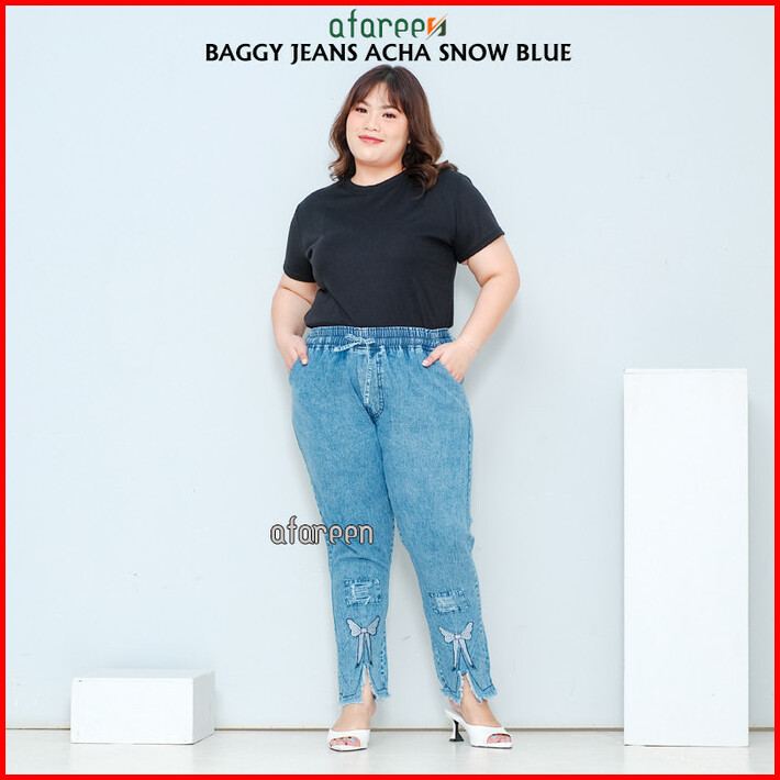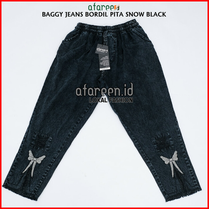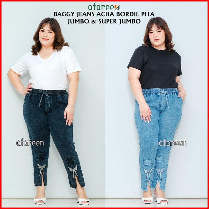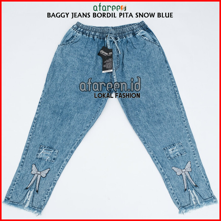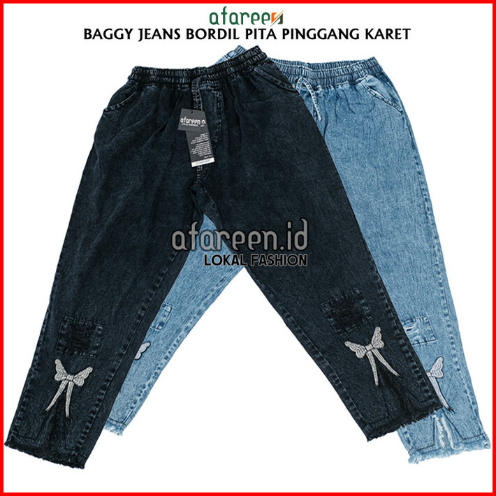 Baggy Jeans Wanita Bordir Celana Jeans Pinggang Karet Kolor Jumbo