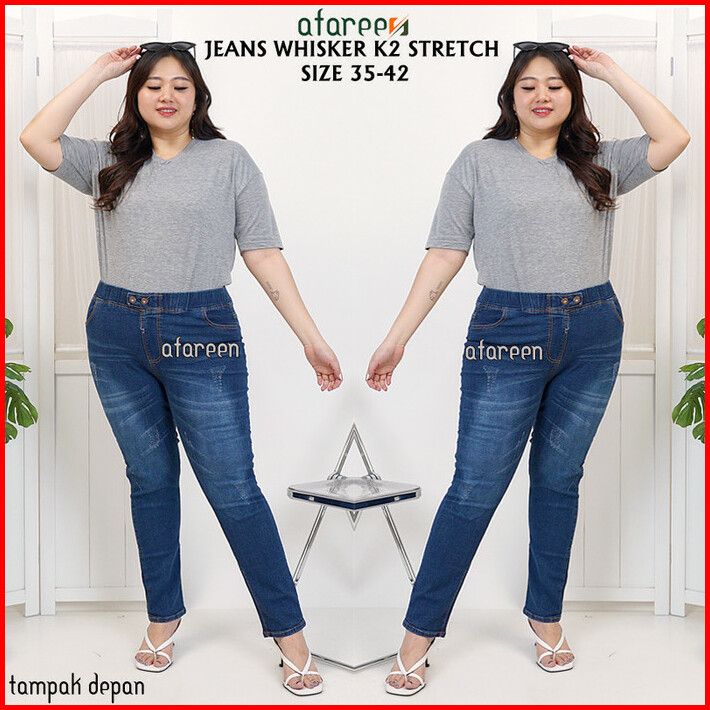 Celana Jeans Wanita Plus Size Jeans Panjang Whisker Jumbo