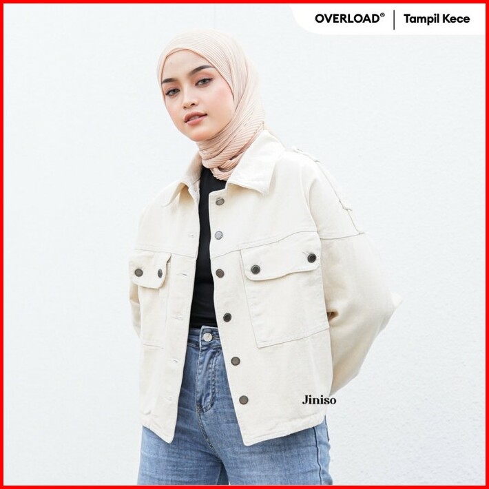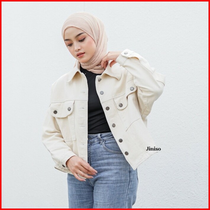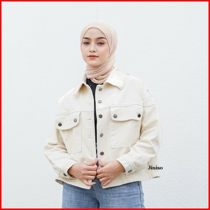 Jiniso Jaket Crop Jeans Oversize Pocket Khaki