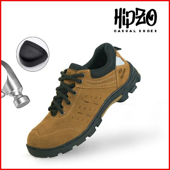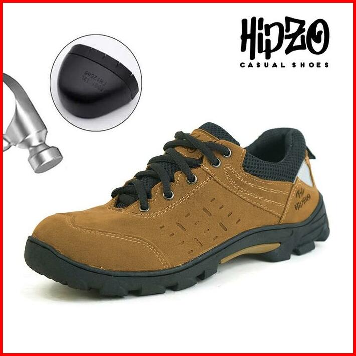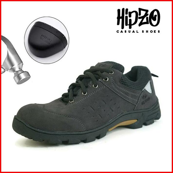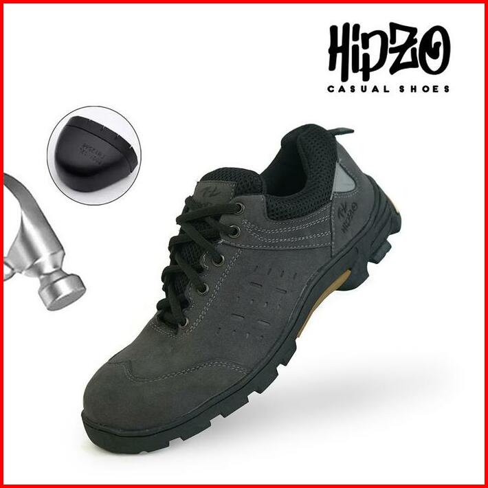 Hipzo Sepatu Safety Sport Ujung Besi M076 Untuk Pria Kerja Outdoor Ori Tambang Proyek Sol Full Karet Hitam Shoes