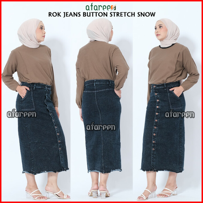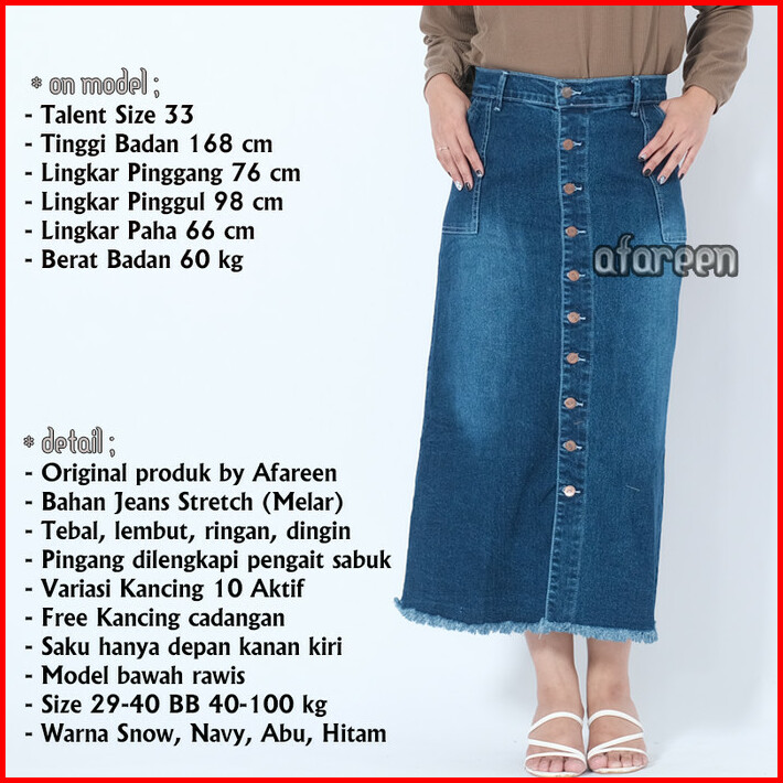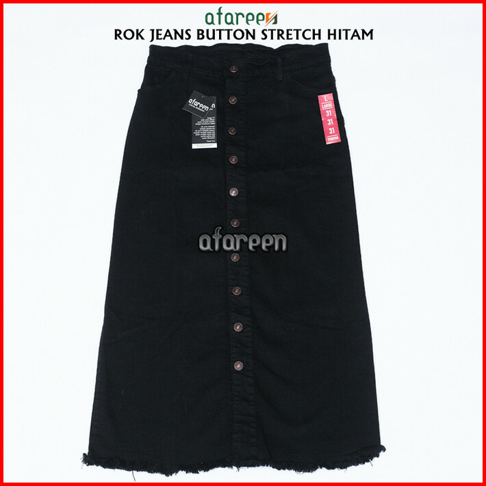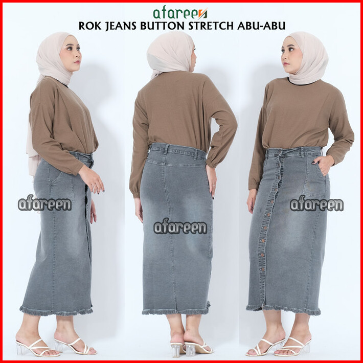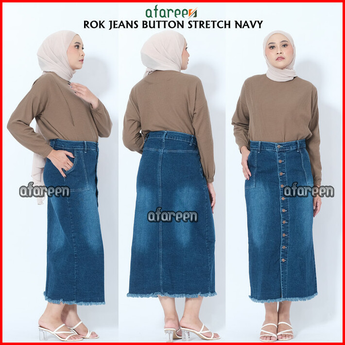 Rok Jeans Panjang Span Rok Denim Rawis Rok Jeans Kancing Depan Stretch