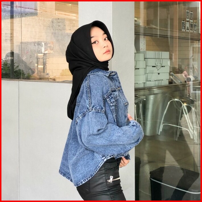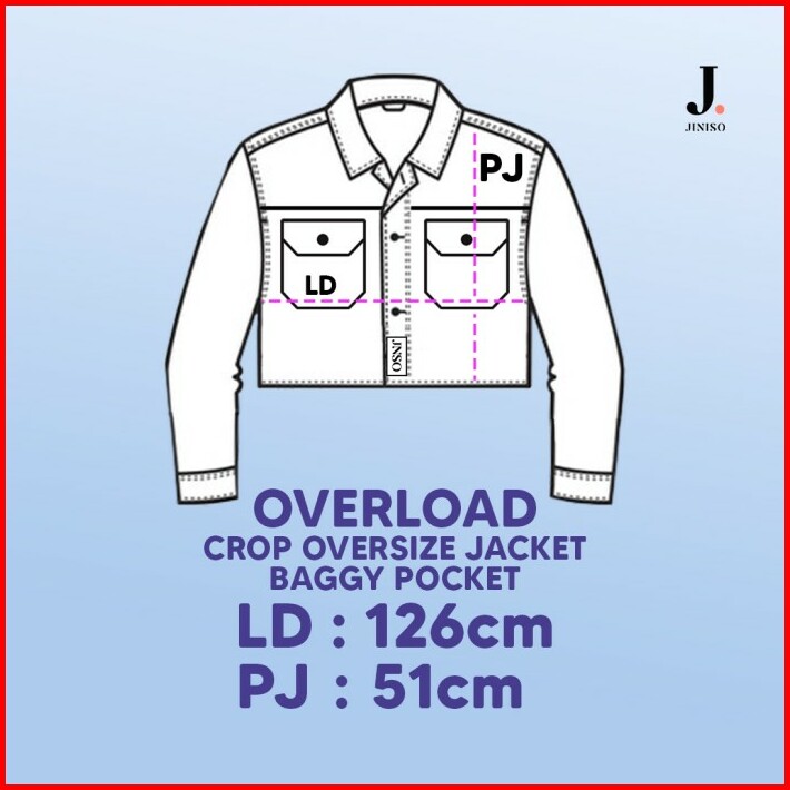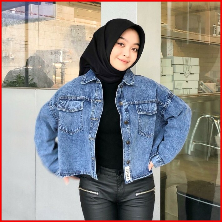 Jiniso Jaket Crop Jeans Oversize Baggy Pocket Blue Acid
