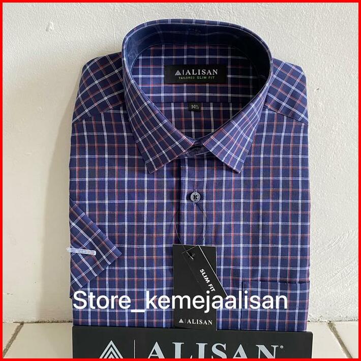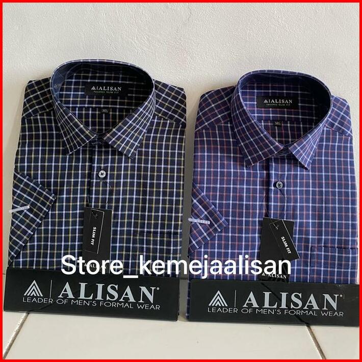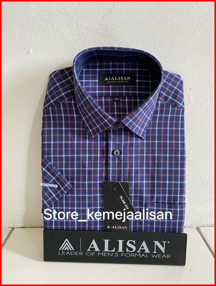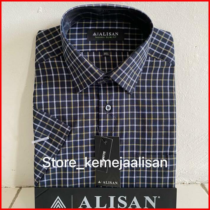 Kemeja Alisan Slimfit Lengan Pendek Motif Kotak Hitam Kuning Dan Biru Merah