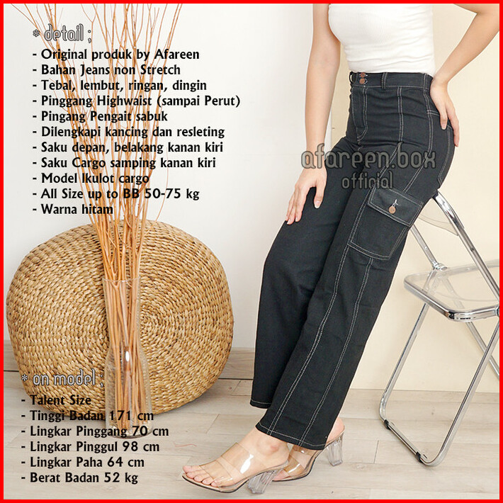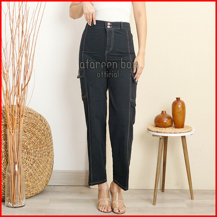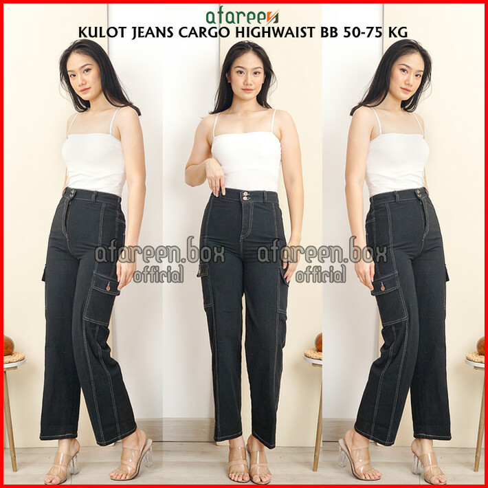 Celana Jeans Cargo Wanita Highwaist Kulot Jeans Cargo Pinggang Karet
