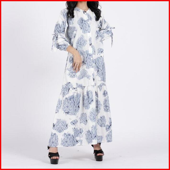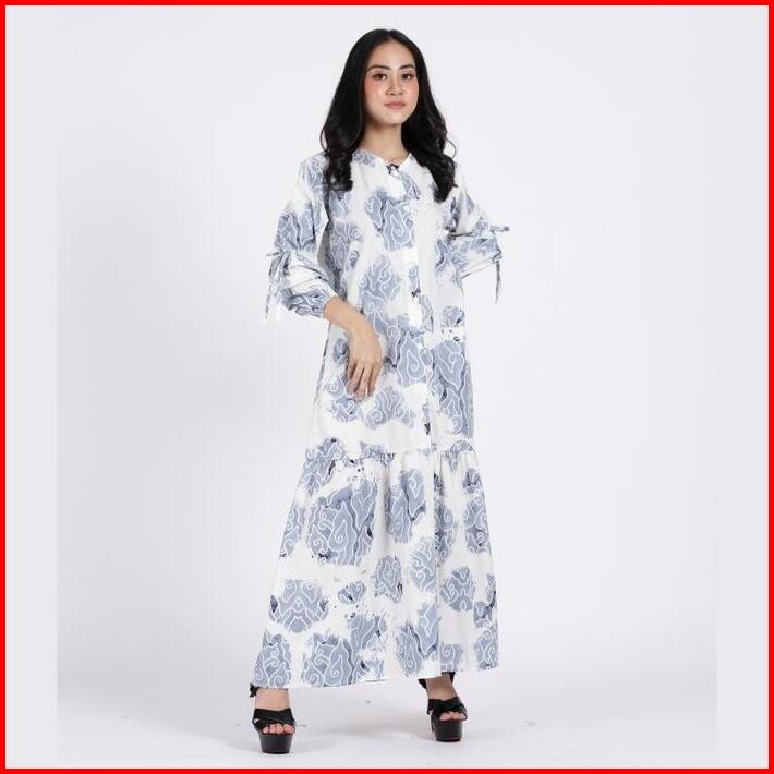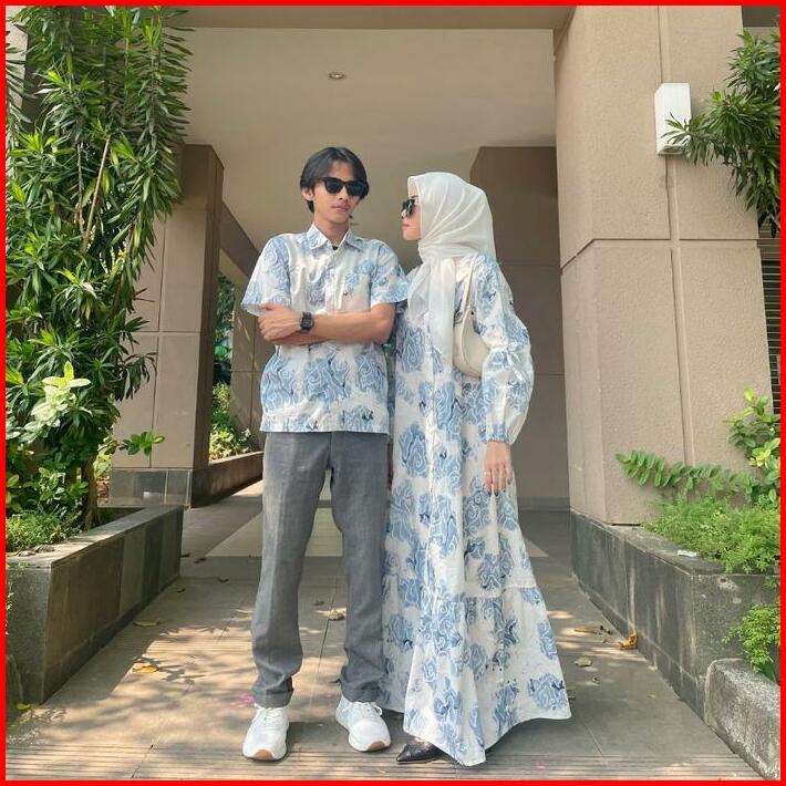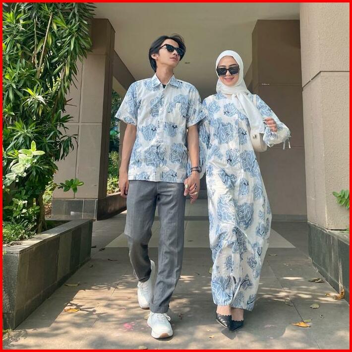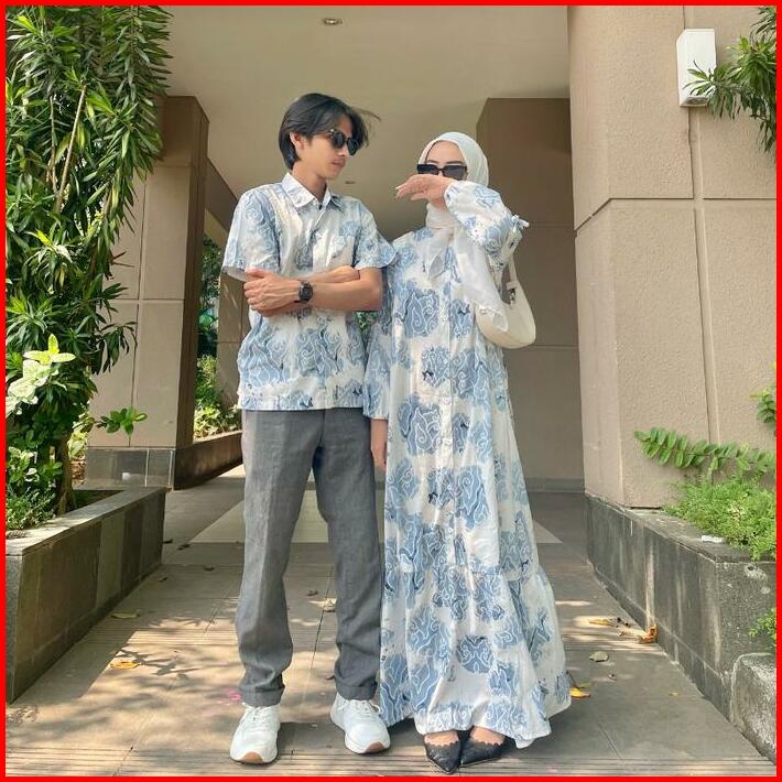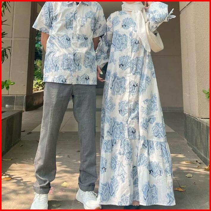 Batik Trusmi Set Couple Dress Dan Kemeja Batik Motif Mega Mendung Bumi Pita Biru Katun Baju Pasangan Sarimbit Keluarga K
