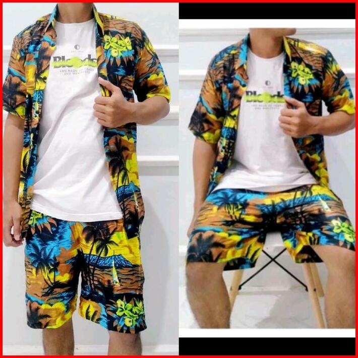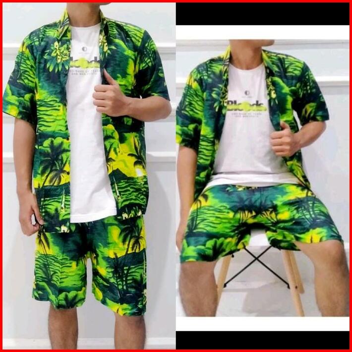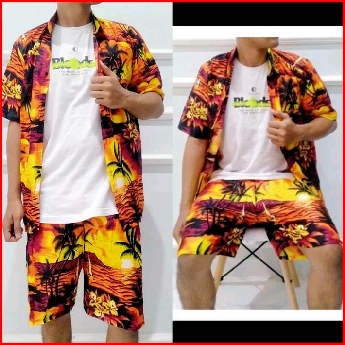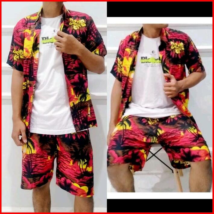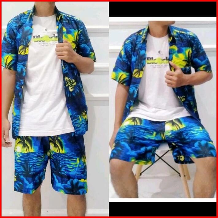 Setelan Dewasa Pria Lengan Pendek Motif Pantai Rayon Premium One Set Kemeja Pantai Seragam Batik