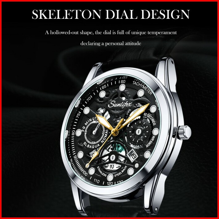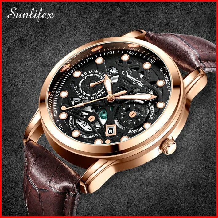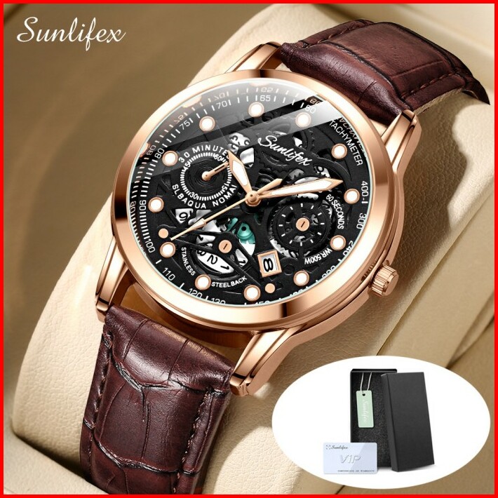 Sunlifex Jam Tangan Pria Santai Kalender Tali Kulit Display Kuarsa