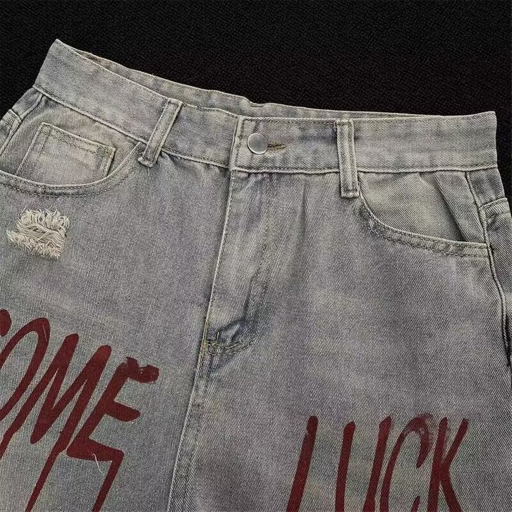 Celana Panjang Pria Wanita Ripped Jeans Fashion Korea Retro Graffiti Robek Celana Jeans Longgar Kaki Lebar Lurus