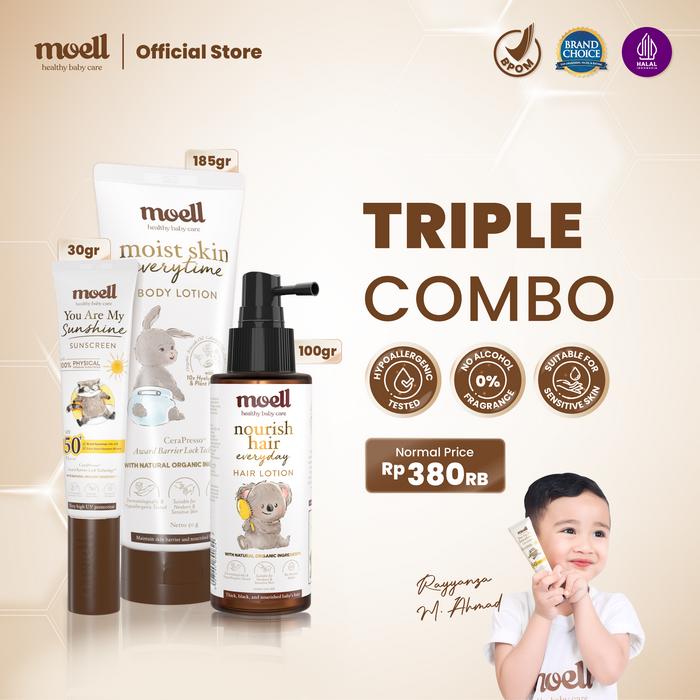 Moell Triple Combo - Hair Lotion 100ml & Physical Sunscreen 30ml & Body Lotion 185ml #Natural Organic #Skincare Bayi