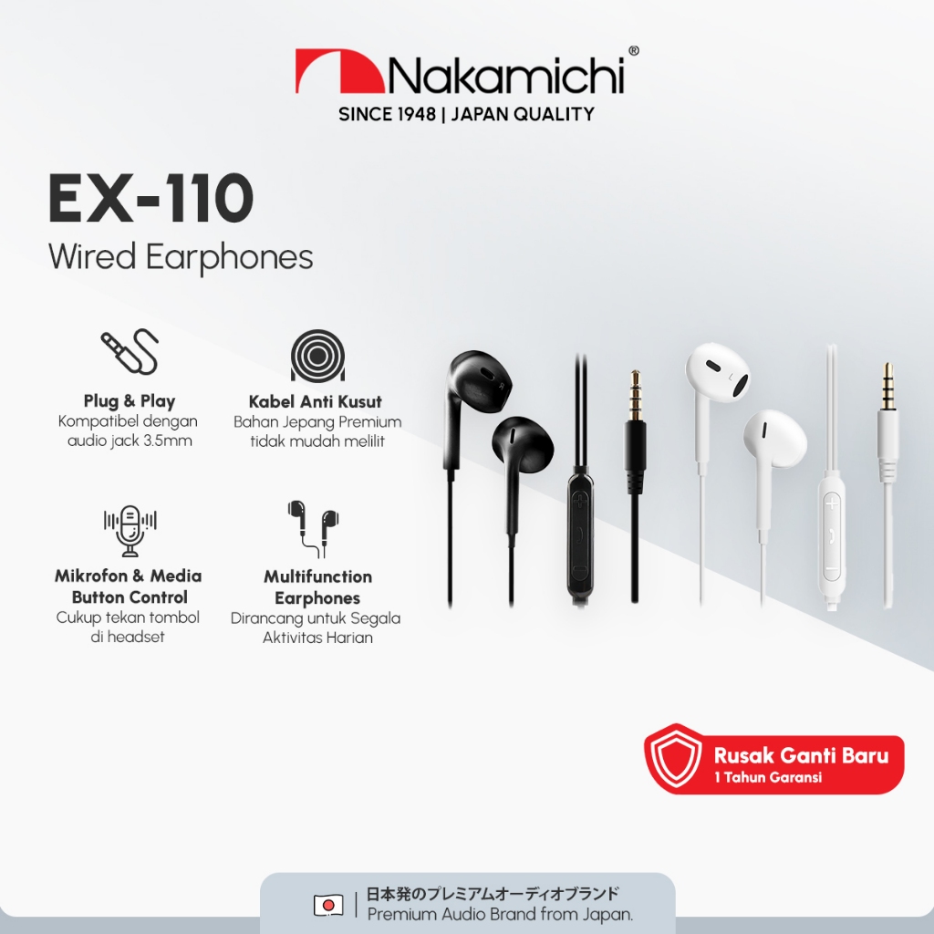 HEADSET KABEL NAKAMICHI EX110 PREMIUM WIRED EARPHONE FULL BASS MIC JACK 3.5MM ORIGINAL MURAH TERLARIS