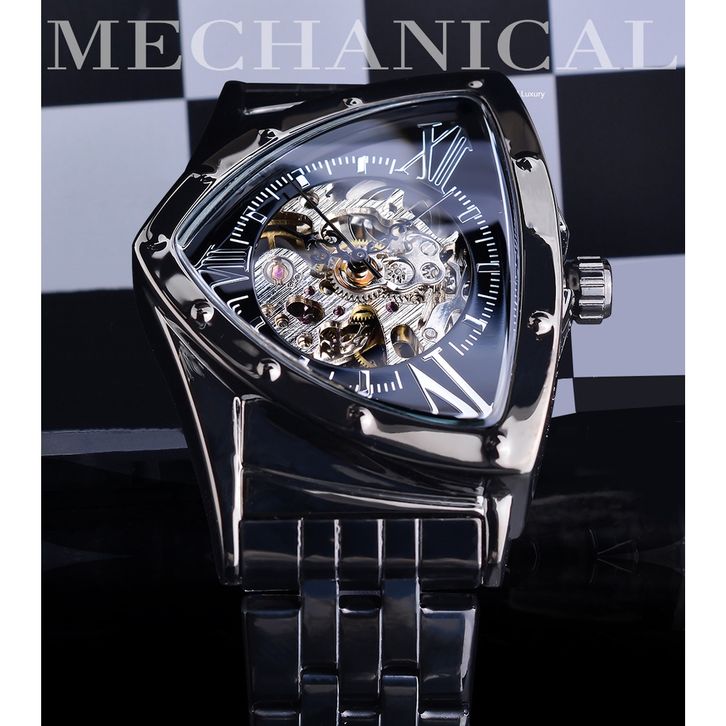 EKSKLUSIF DUNCOUGAR Triangle Skeleton Black Automatic Watch Stainless Steel Men Business Sport Irregular
