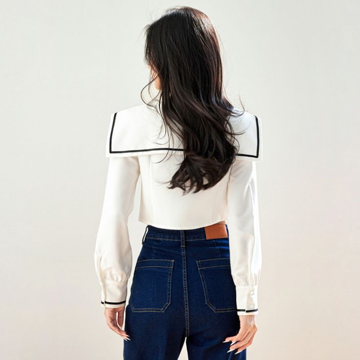 MEET.U Kemeja Lengan Panjang Kerah V Wanita Warna Putih Desain Chic Blus Sifon Navy Collar