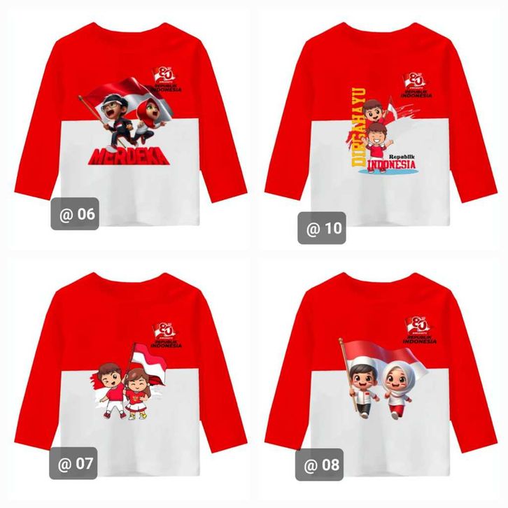 Baju Santai Kaos Motif MERDEKA MERAH PUTIH AGUSTUSAN Oblong Lengan Panjang Usia 2-12 Tahun Atasan Anak Laki -Laki