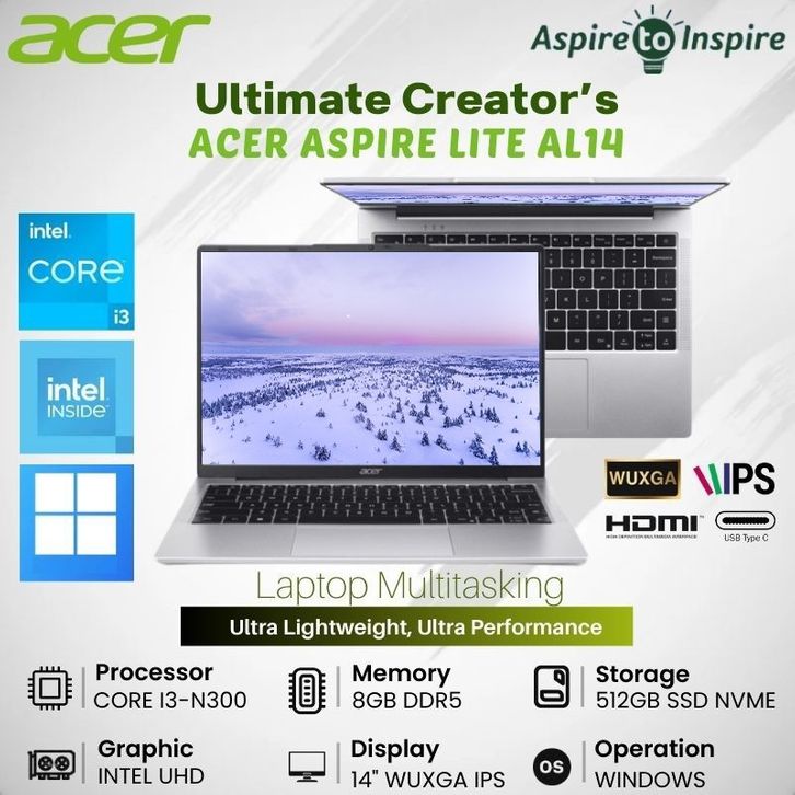 Terlaris ACER Aspire Lite 14 AL14-31P Intel N300 8GB 512GB 14" IPS WUXGA W11 Keren