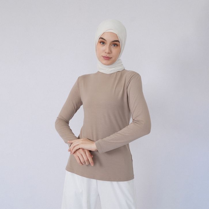 TERLAKU Queensland Funnel Neck Manset Polos Lengan Panjang Wanita LIN000496Q Oatmilk aselg