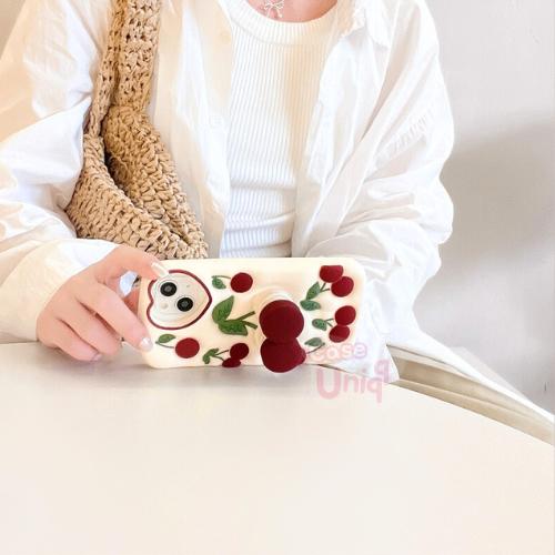 CASEUNIQQ Case Cherry Popsocket 3D Silicone Love Red Casing HP iP timbul griptok Compatible with iPhone 16 Plus softcase