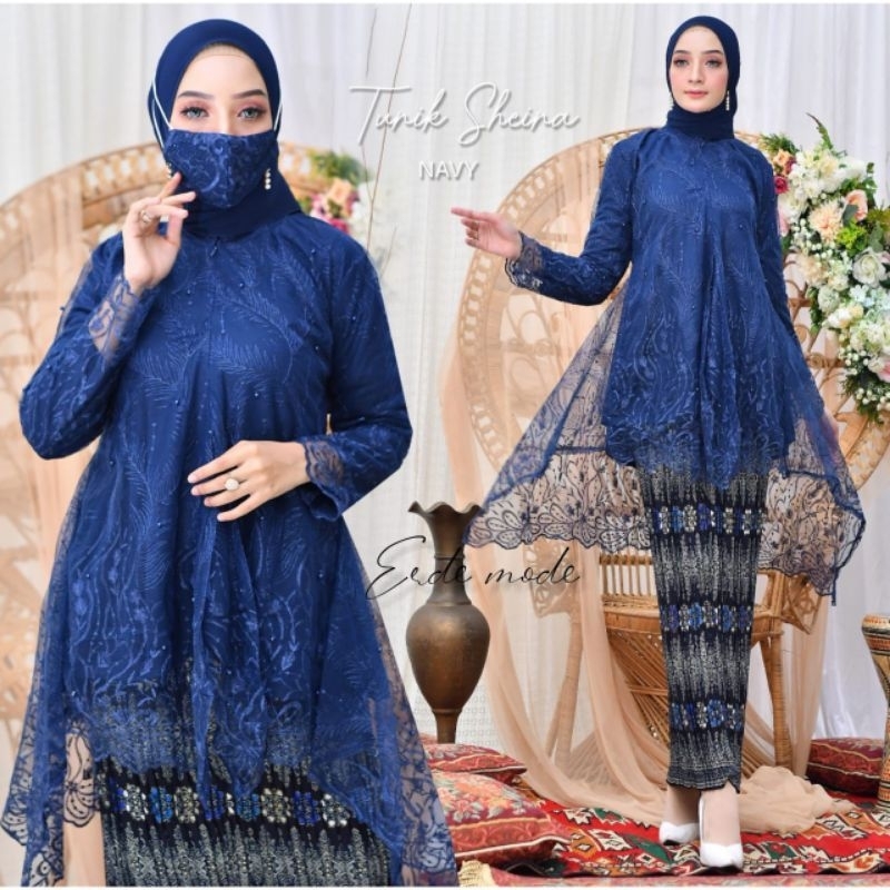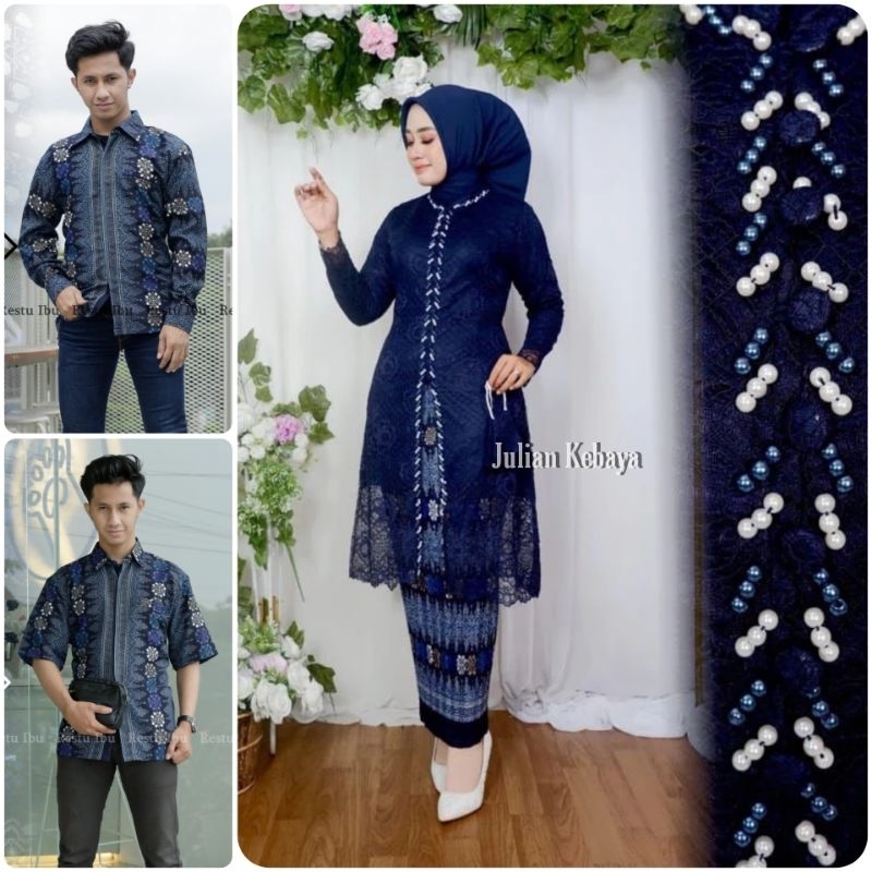 Setelan Pasangan Kebaya Brokat Busui Payet Modern Jumbo Dan Kemeja Batik Ayah Anak Motif Toraja Navy