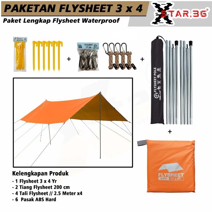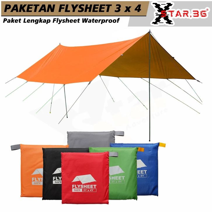 paketan lengkap flysheet tenda camp waterproof 3x4 yard flysheet tiang tali guyline pasak abs