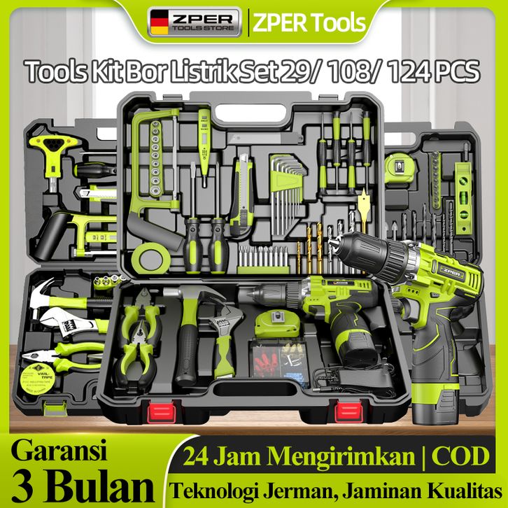 PROMO ZPER Satu Set Alat Perkakas Bor Listrik Cordless Tang Obeng Palu Kunci Pas Toolkit 124 in1 pcs ZP027