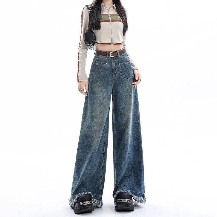 Celana Jeans Wanita kaki lebar retro untuk wanita celana panjang lantai rumbai tepi mentah pinggang tinggi