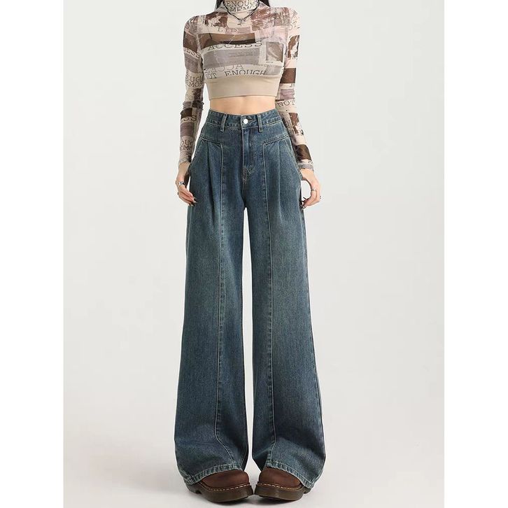 Jeans Kaki Lebar Vintage Untuk Wanita Celana Lurus Pinggang Tinggi Kebesaran