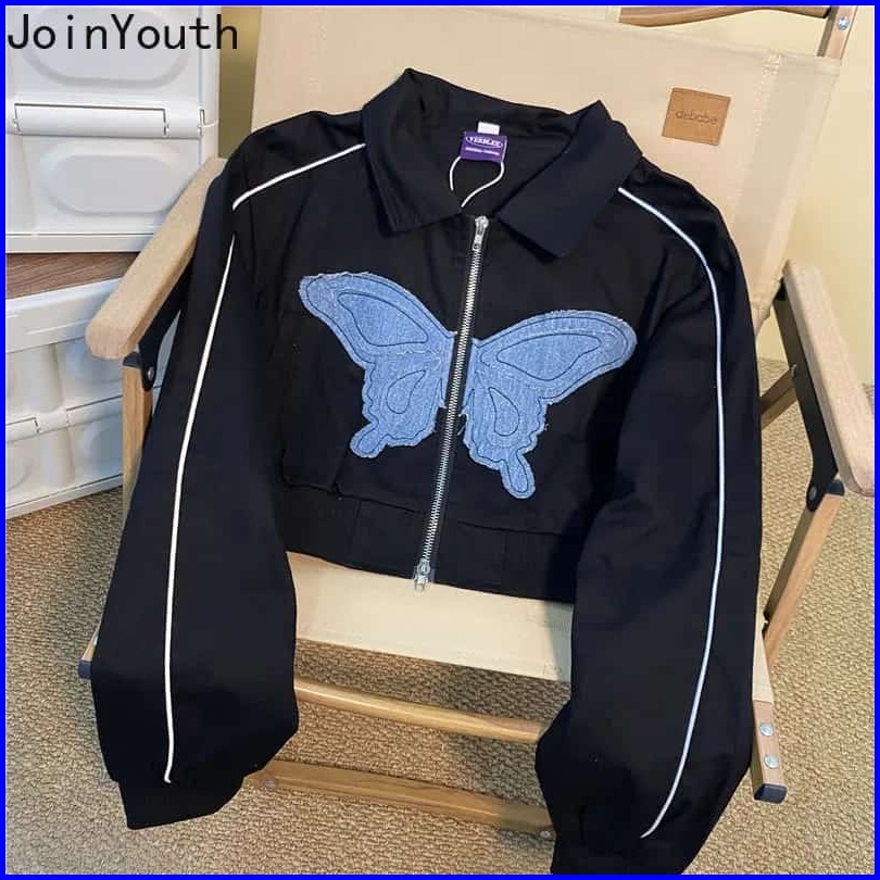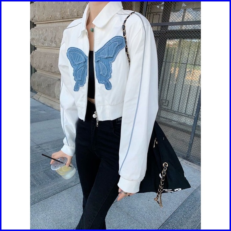 Femes Butterfly Jaket Crope Outerwear Wanita Remaja Matt Fleece Sablon Ootd Korean Style Casual Daily