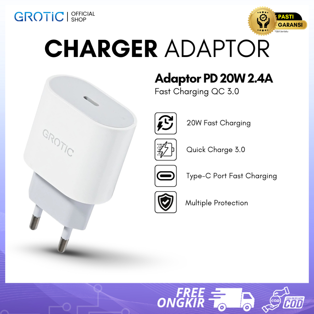 GROTIC Charger Adaptor PD 20W 2.4A Kepala Charger Fast Charging QC3.0 Type-C Lightning