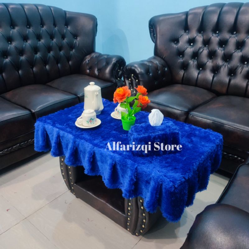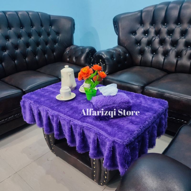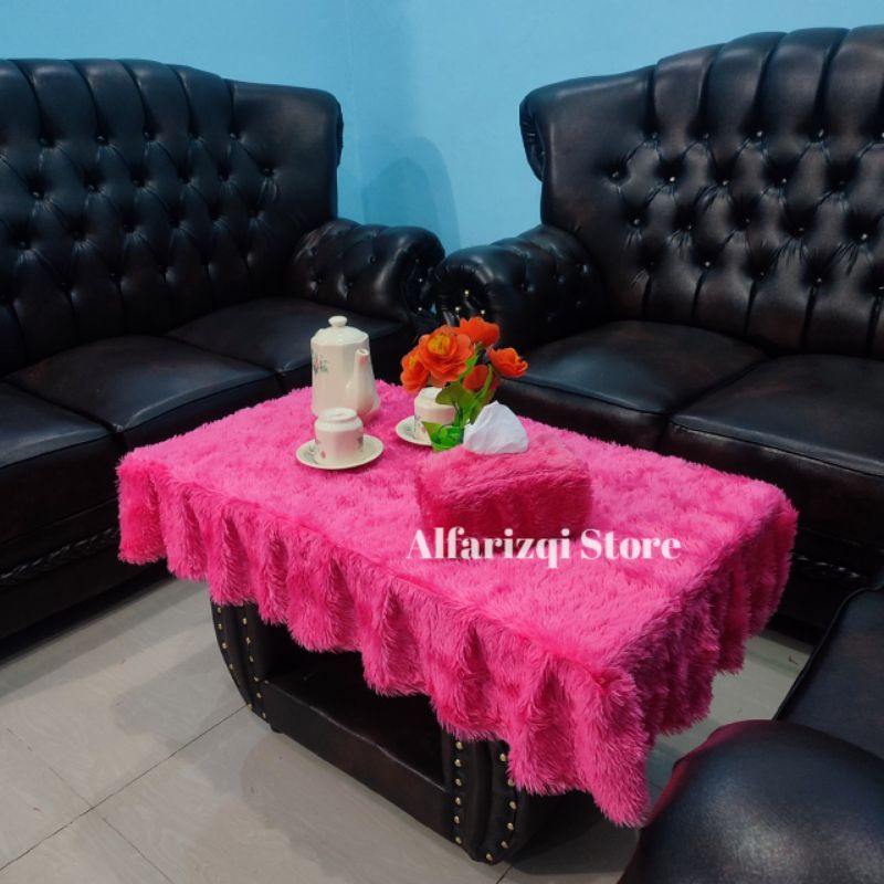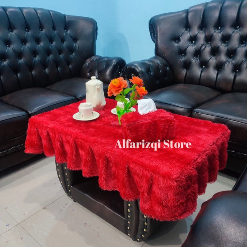Taplak meja rumbai bulu rasfur + Sarung tisu bulu rasfur / Taplak meja bulu r tamu premium