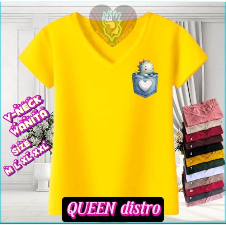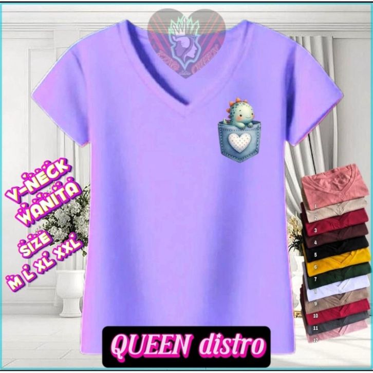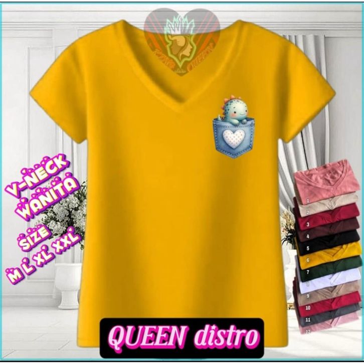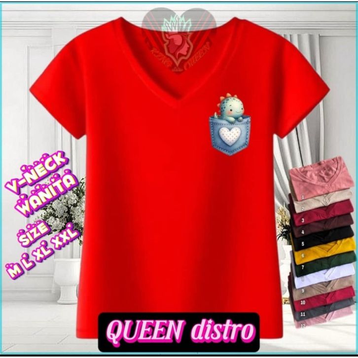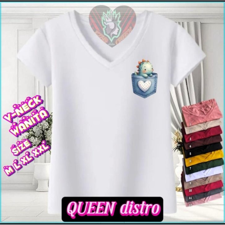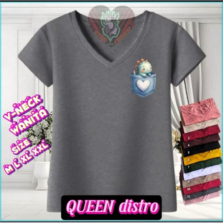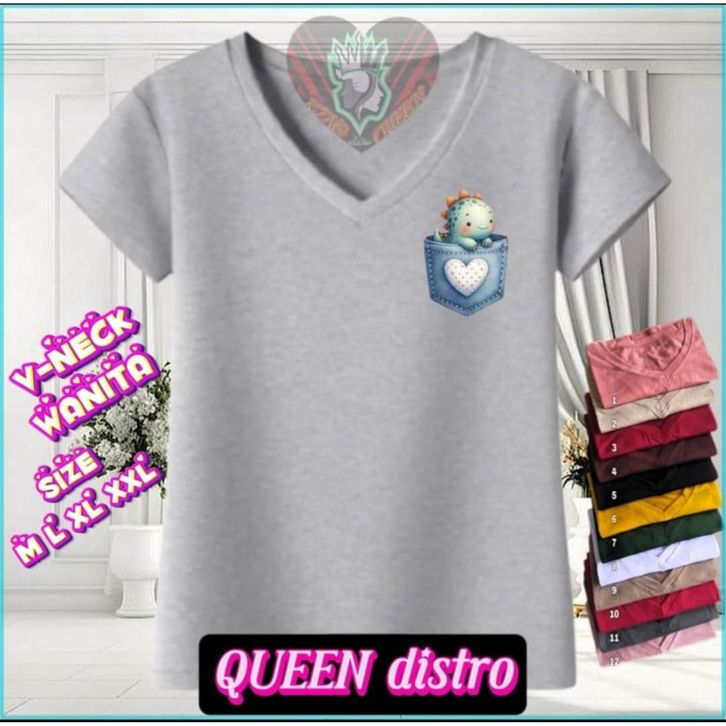 KAOS V NECK WANITA ABG MOTIF DINO POCKET LOVE BAHAN LEMBUT DAN ADEM