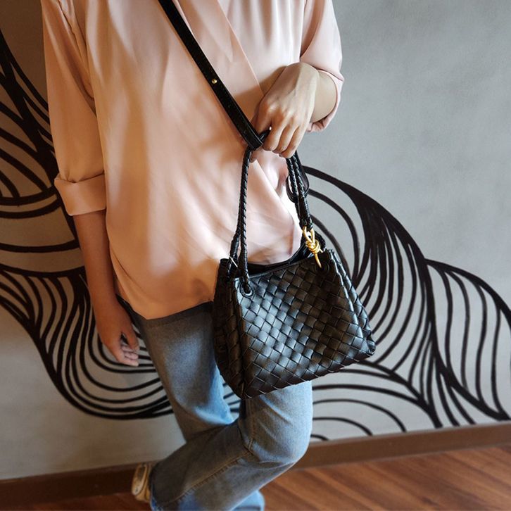 JWETNIK BBS-43BK BLACK BOWI LEATHER BUCKET WOVEN BAG SHOULDER AND CROSSBODY BAG ( NO LOGO )