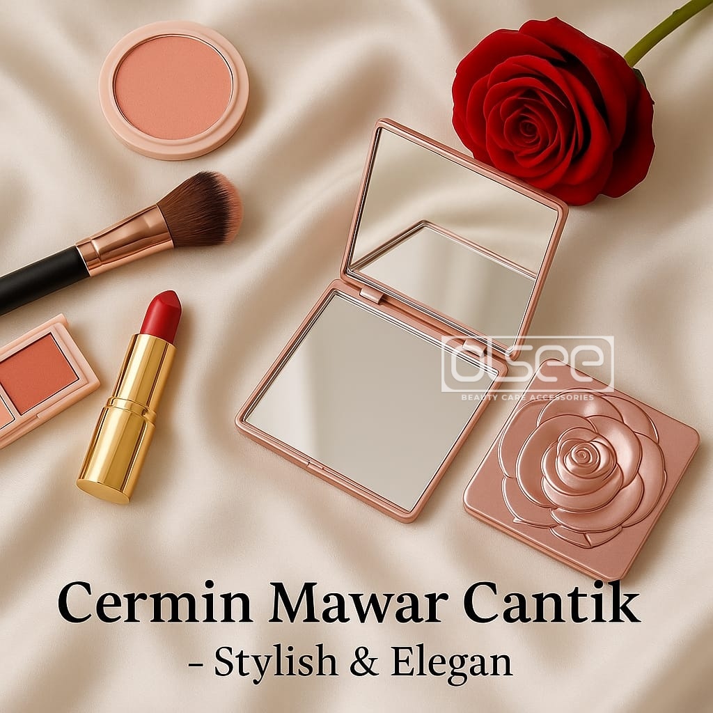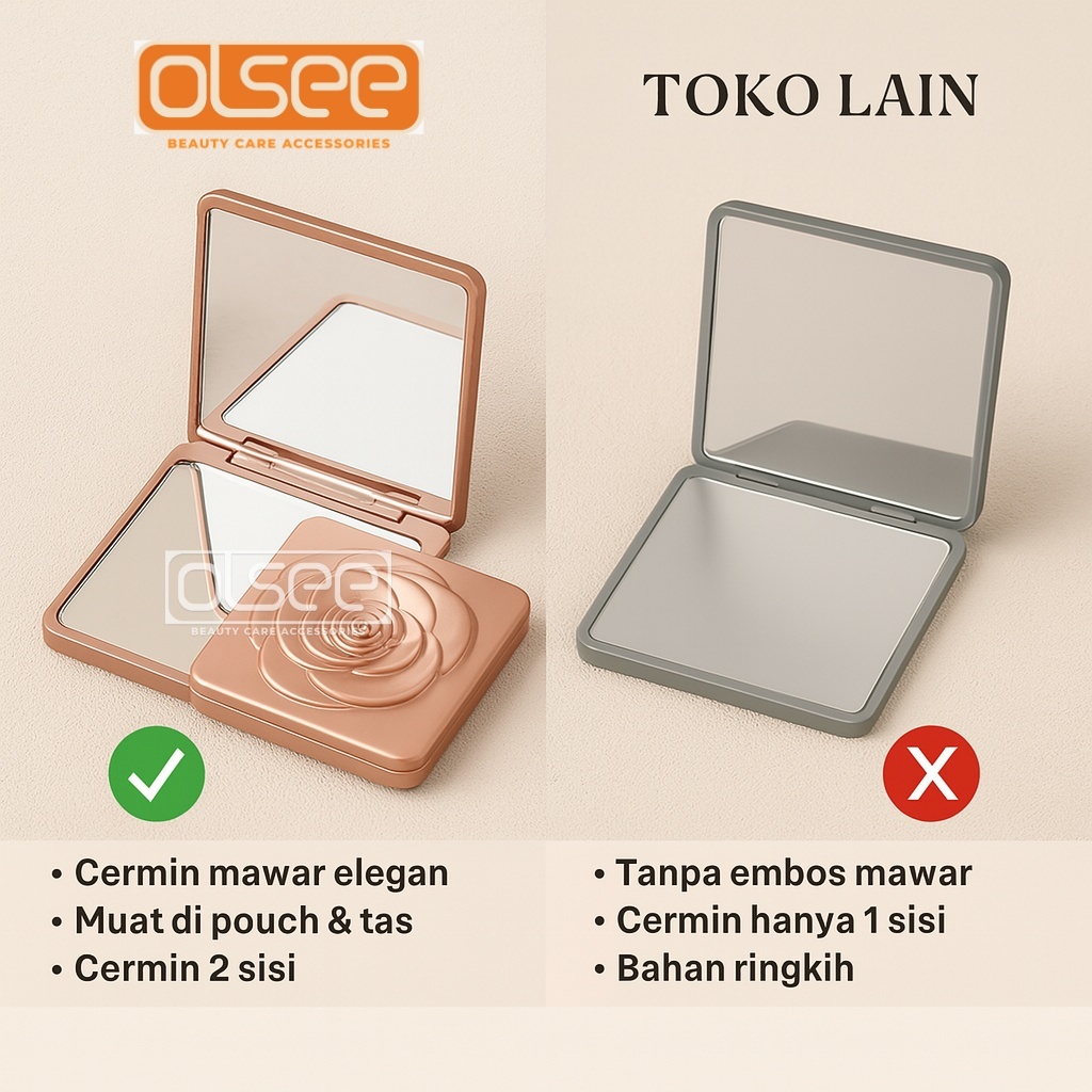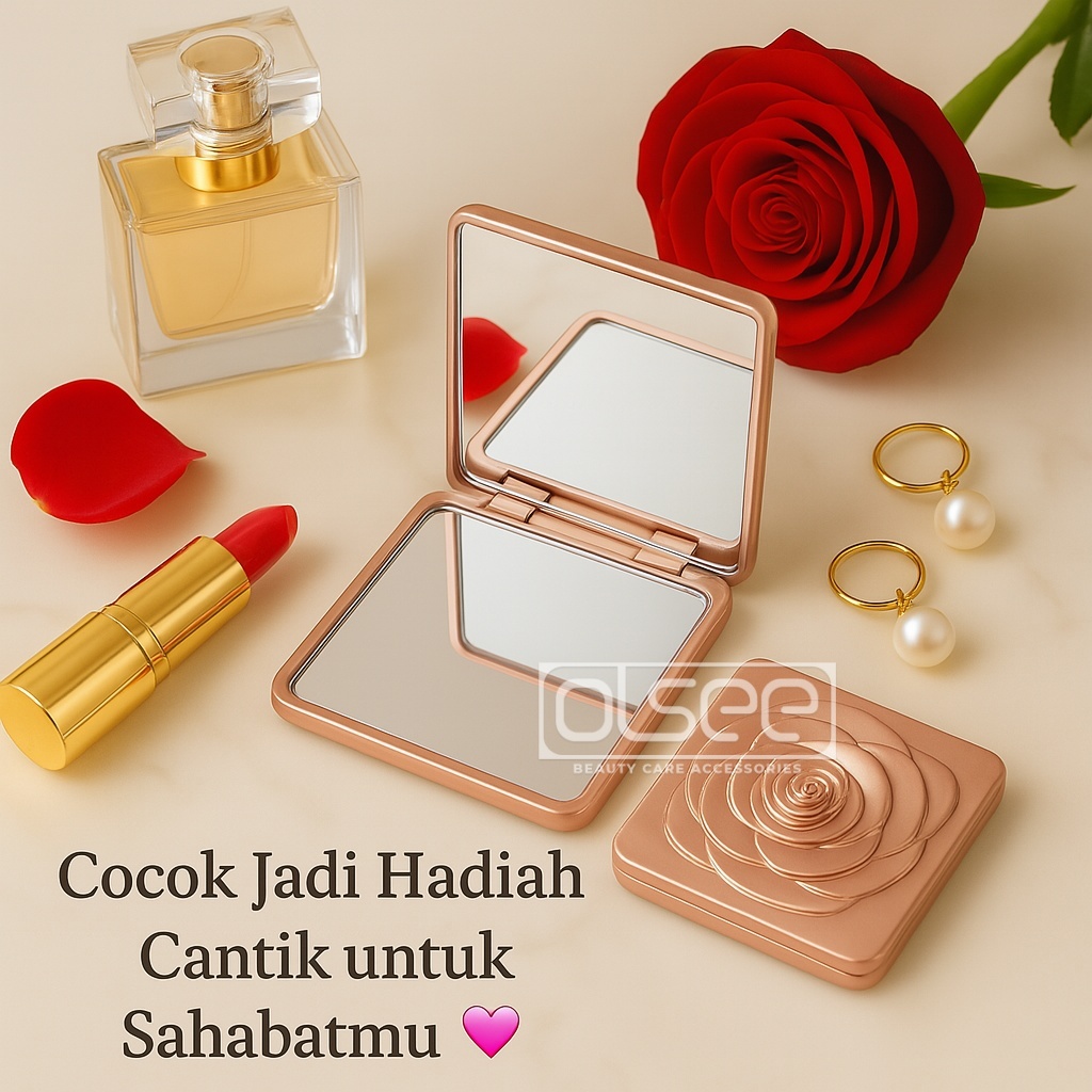 OLSEE- CERMIN KACA RIAS LIPAT MINI AESTHETIC BENTUK MAWAR - CERMIN MAKEUP PORTABLE 2 SISI DENGAN KACA PEMBESAR 3X UNTUK