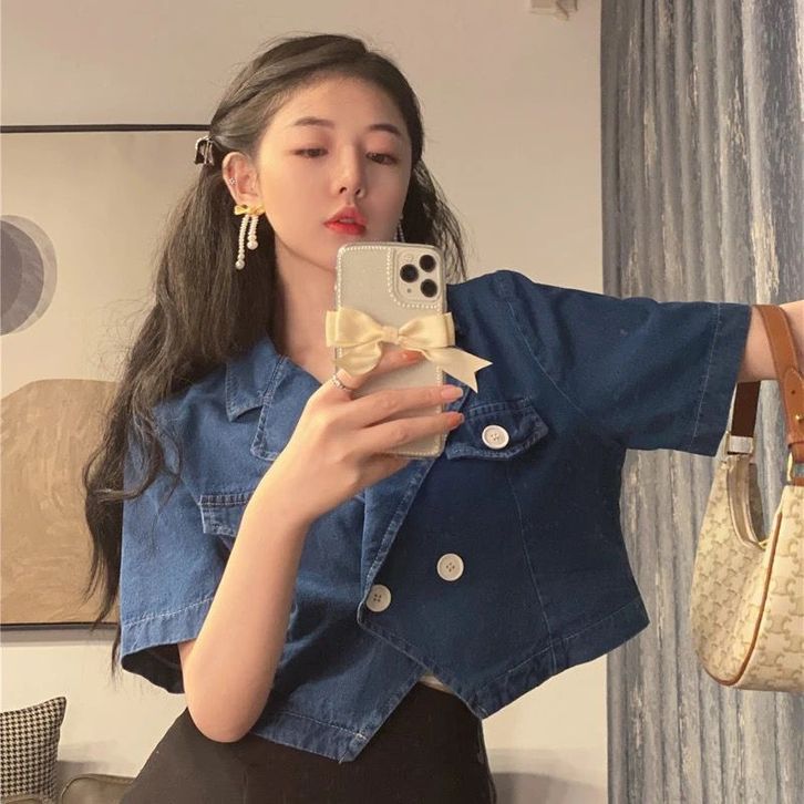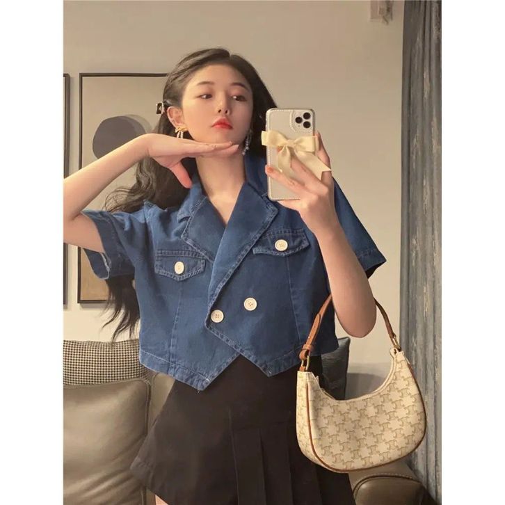 Kemeja Blazer Jeans Crop Wanita Atasan Denim Wanita Modis Lengan Pendek Kemeja Jeans Crop Wanita