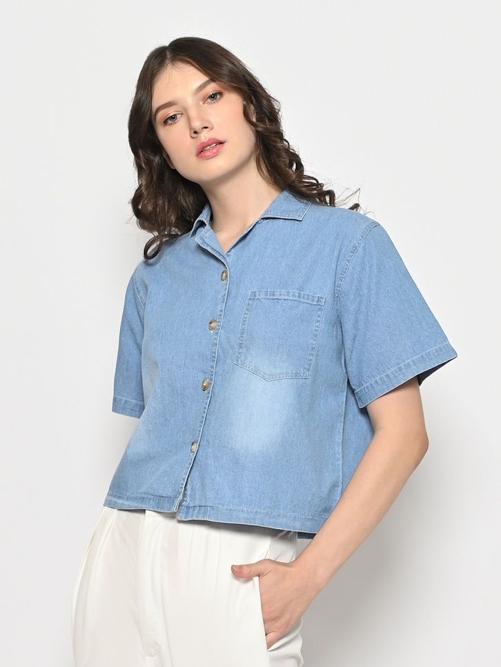 Kemeja Crop Casual Wanita Atasan Wanita Denim Crop Denim Jeans Lengan Pendek