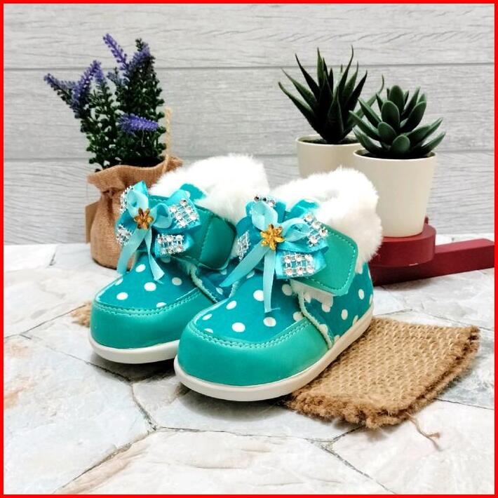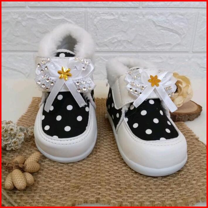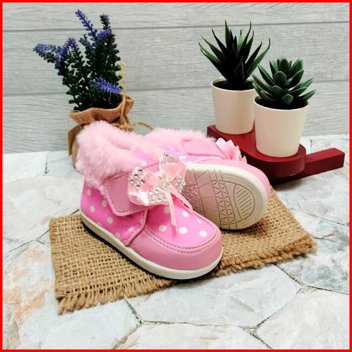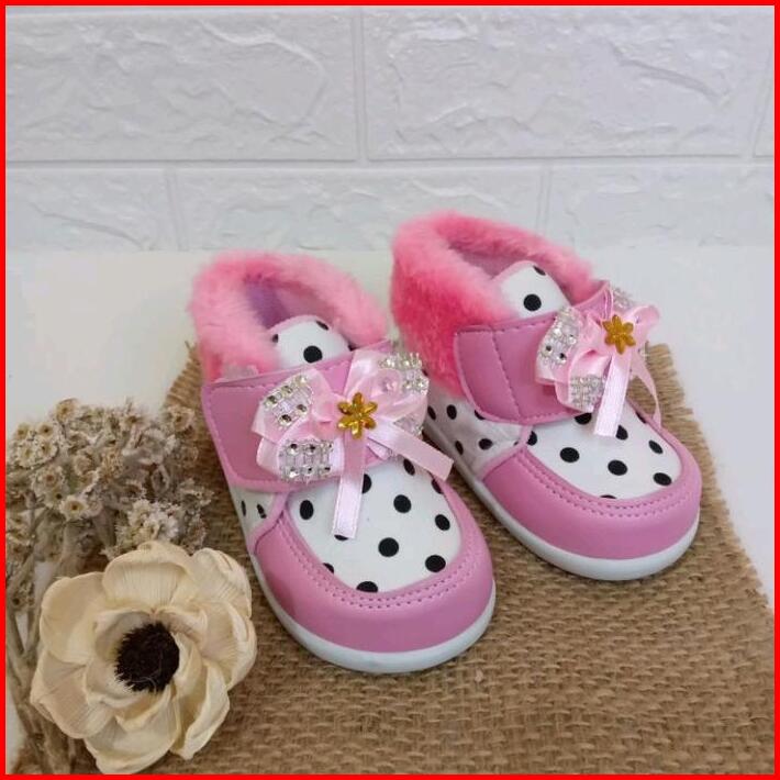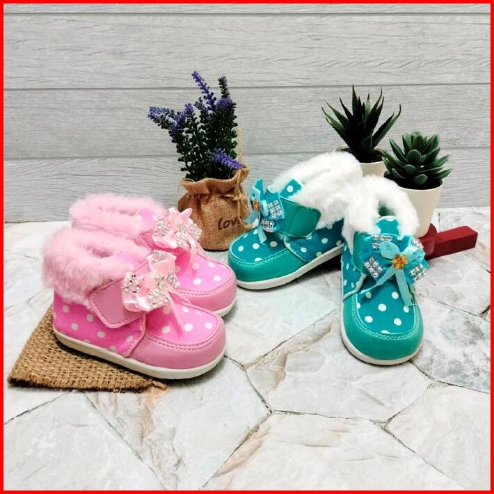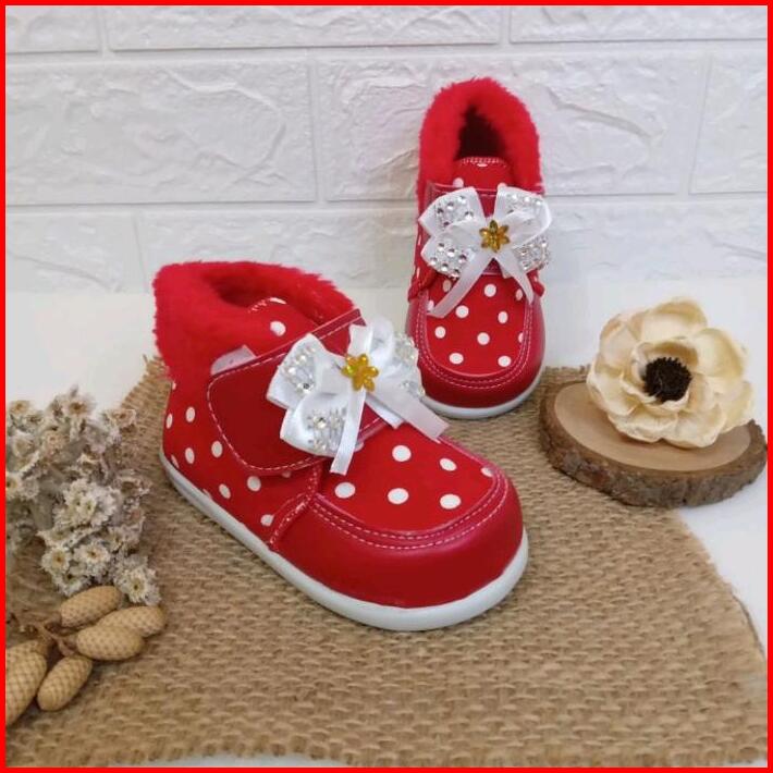 Sepatu Anak Perempuan 1-3 Tahun Sepatu Boots Pesta Motif Polkadot Bulu Pita Lucu Terbaru Fashion Kaki Empuk Kaki Empuk B
