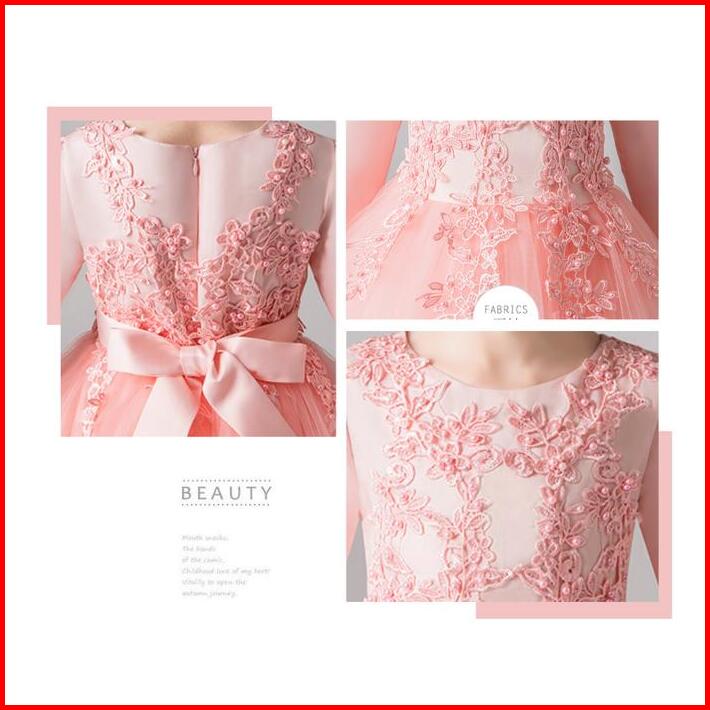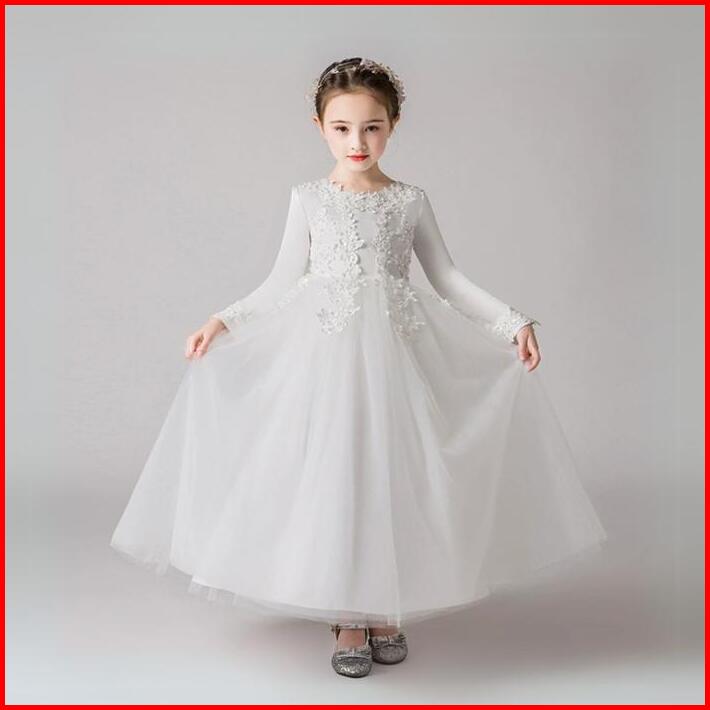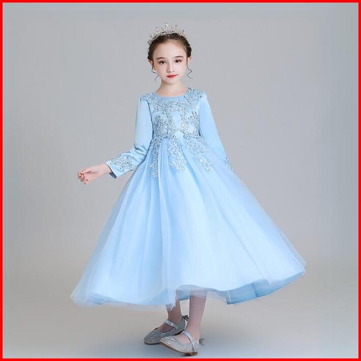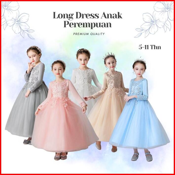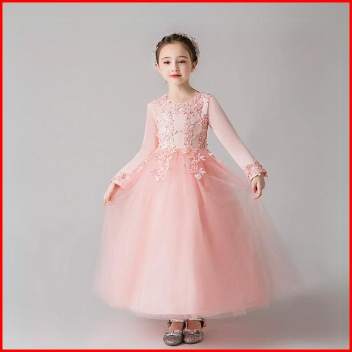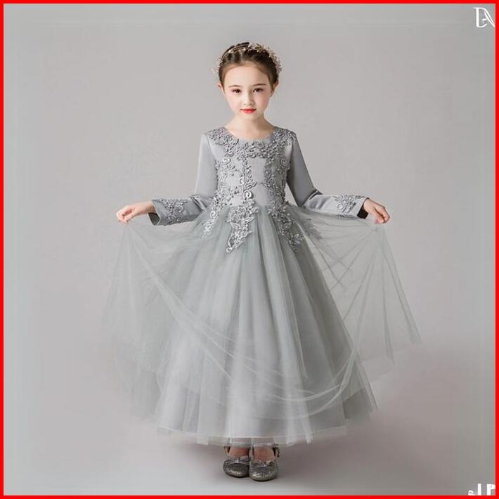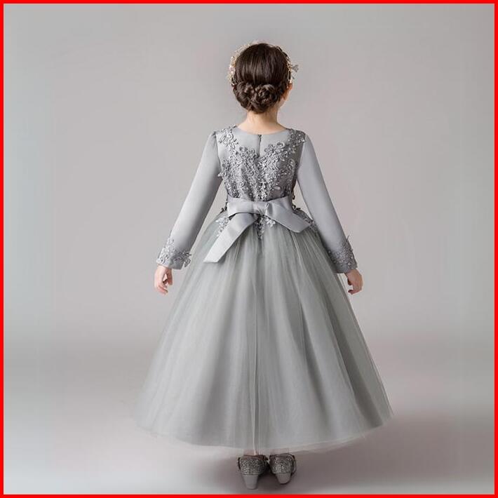 Brandedbaby 5t-11t Dress Pesta Anak Perempuan Lengan Panjang Satin Tulle Bunga Long Dress Anak Perempuan Dress Pesta Mus