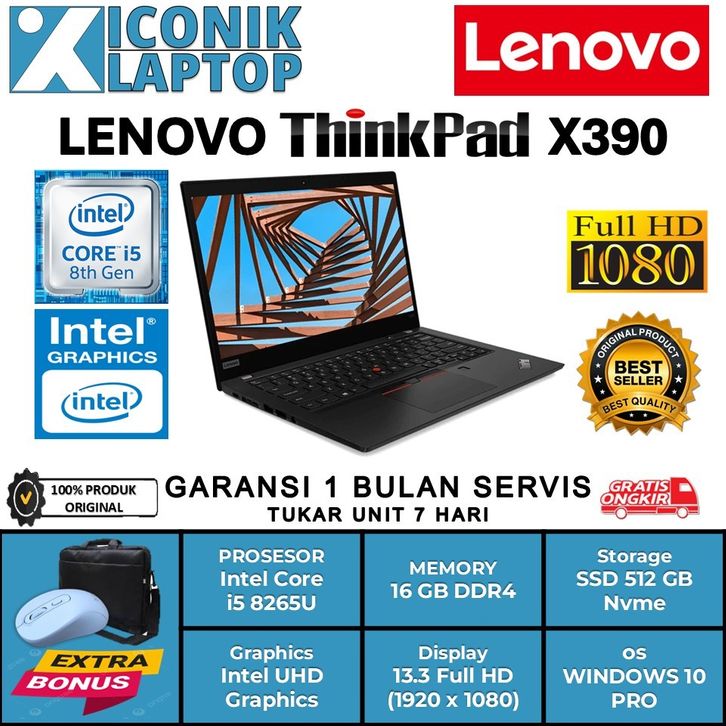Laptop Thinkpad X390 Intel Core i5 8265U Ram 16 GB DDR4 Ssd 512 GB Layar 13.3 Full HD