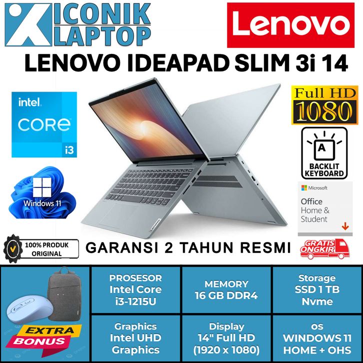 Laptop lenovo Ideapad slim 3i 14 intel Core i3 1215U Ram 16 GB Ssd 1 TB Layar 14 Inc Full HD Resmi