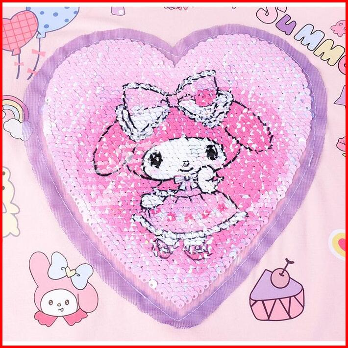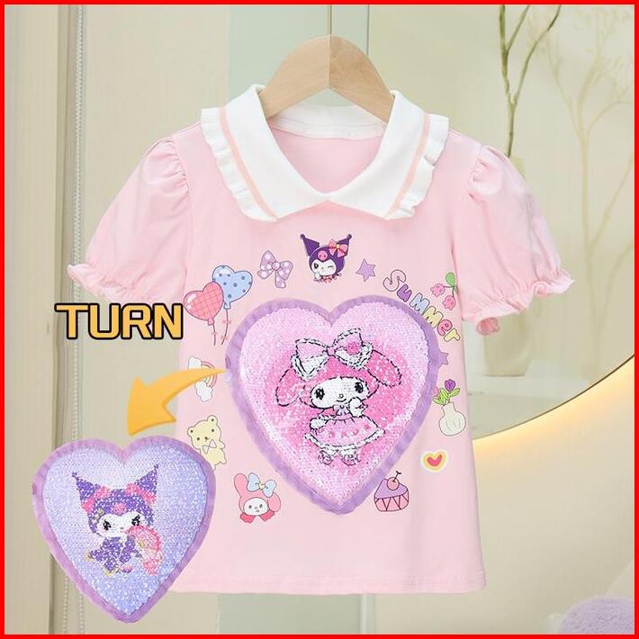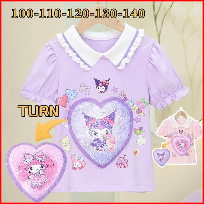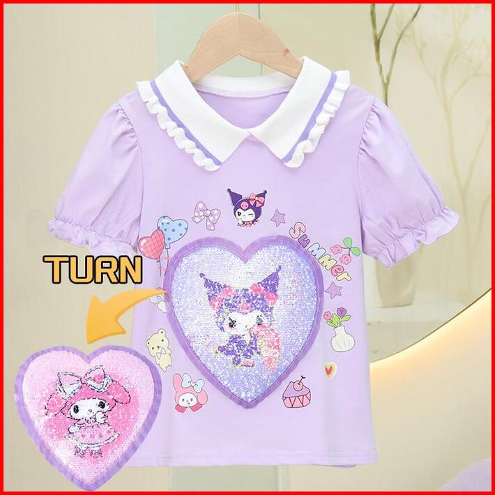 Kemeja Kaos Berkerah Kerah Berubah Gambar Motif Sanrio Kuromi Melody Lengan Bulat Manik Payet Balon