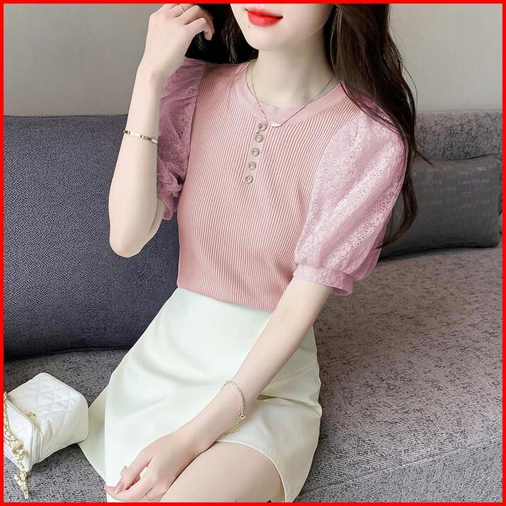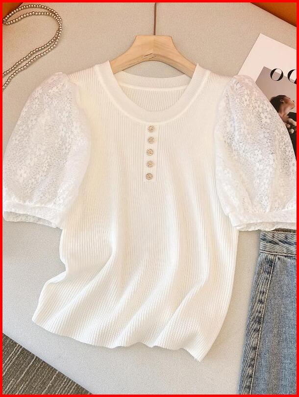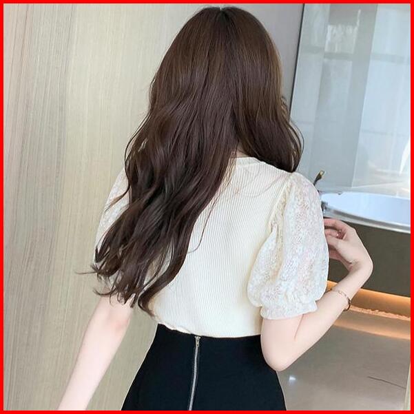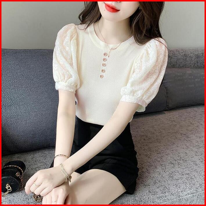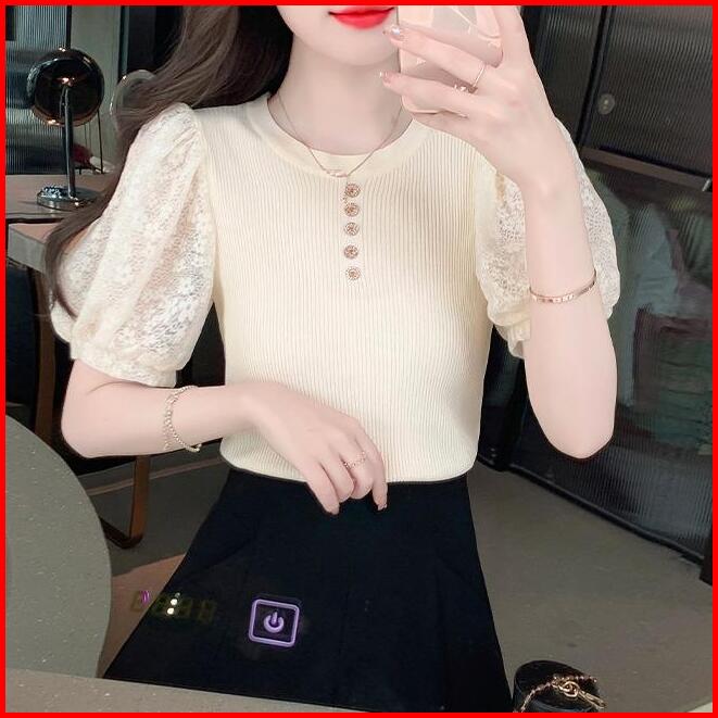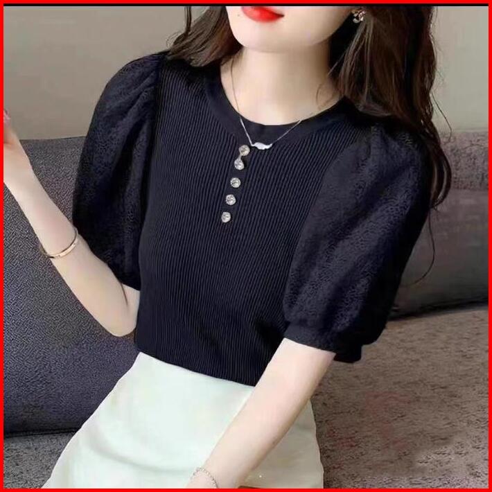 Atasan Lengan Pendek Rajutan Mesh Puff Sleeves Wanita Anggun New Desain