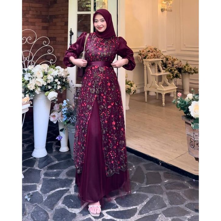 Dress Kondangan Modern Wanita Brukat Soft Tille Garden Mewah Gamis Brokat Wanita Kekinian Vilvet Free Belt