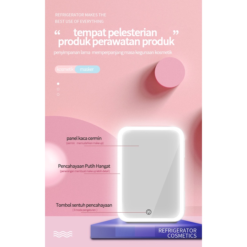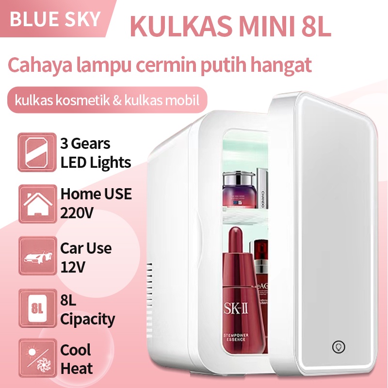 BLUE SKY 8L Kulkas Skincare Mini Fridge LED Mirror Minifridge Portable Cermin Skin Care Minifridge Kosmetik Makanan