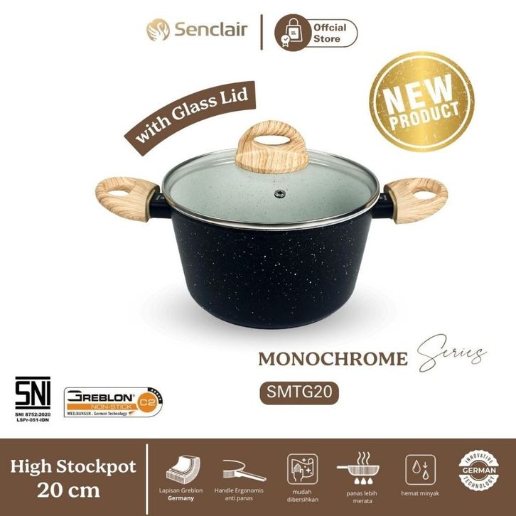 Senclair Monochrome Stockpot Dengan Tutup Kaca Panci Cookware Peralatan Masak Anti Lengket SMTG