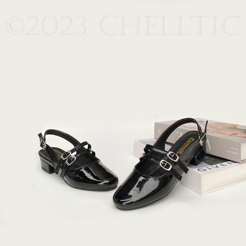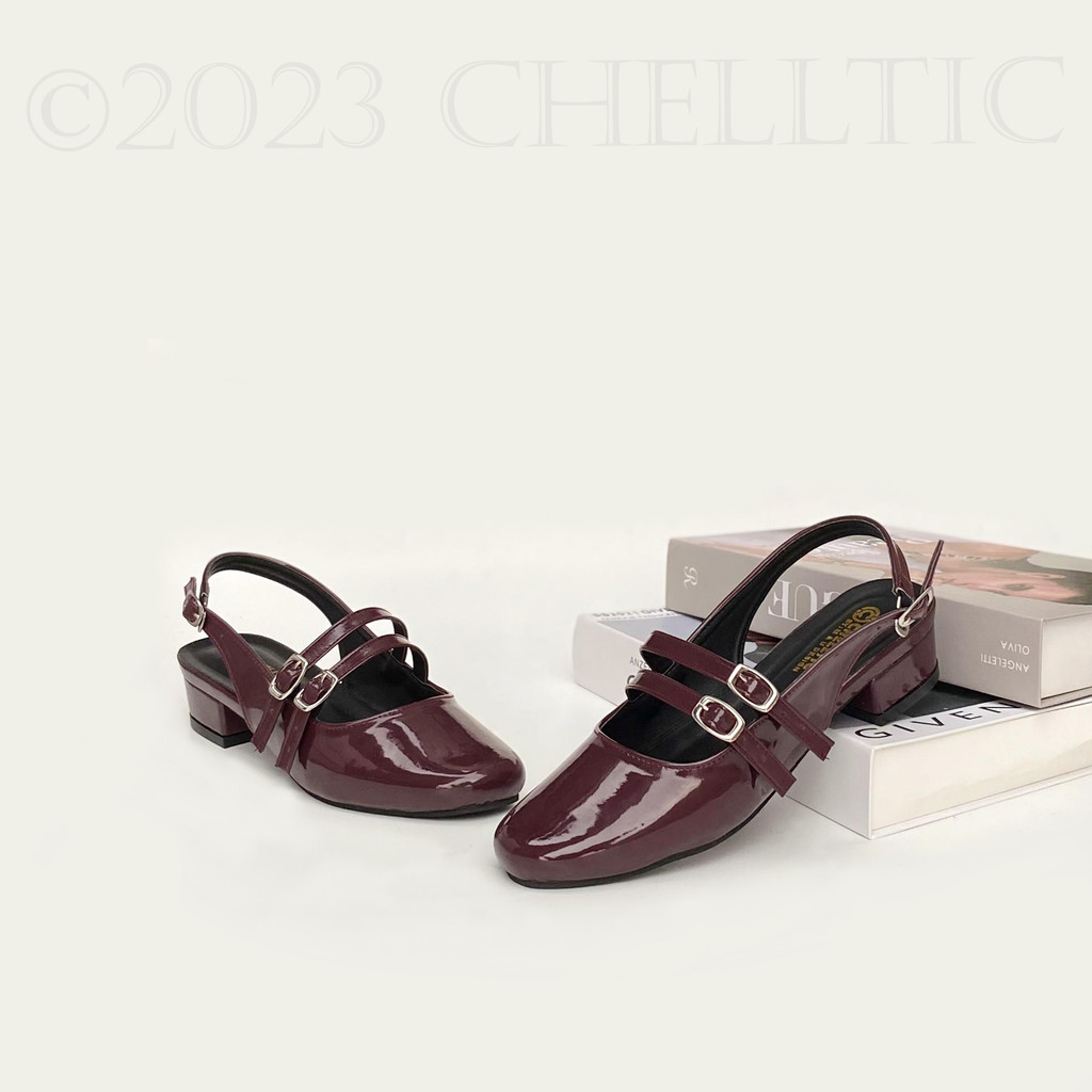 CHELLLTIC Mules Wanita Heels 3cm | Sepatu Selop Slip On Tali Gesper Vintage Glosy