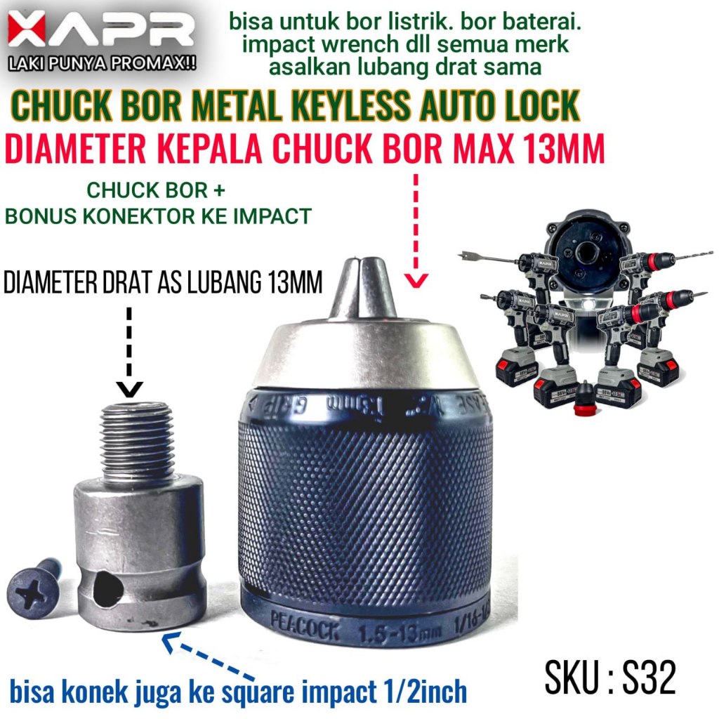 APR S30 S31 S32 KEPALA CHUCK BOR 10MM 13MM KEYLESS METAL AUTO LOCK SINGLE BONUS KONEKTOR KE IMPACT