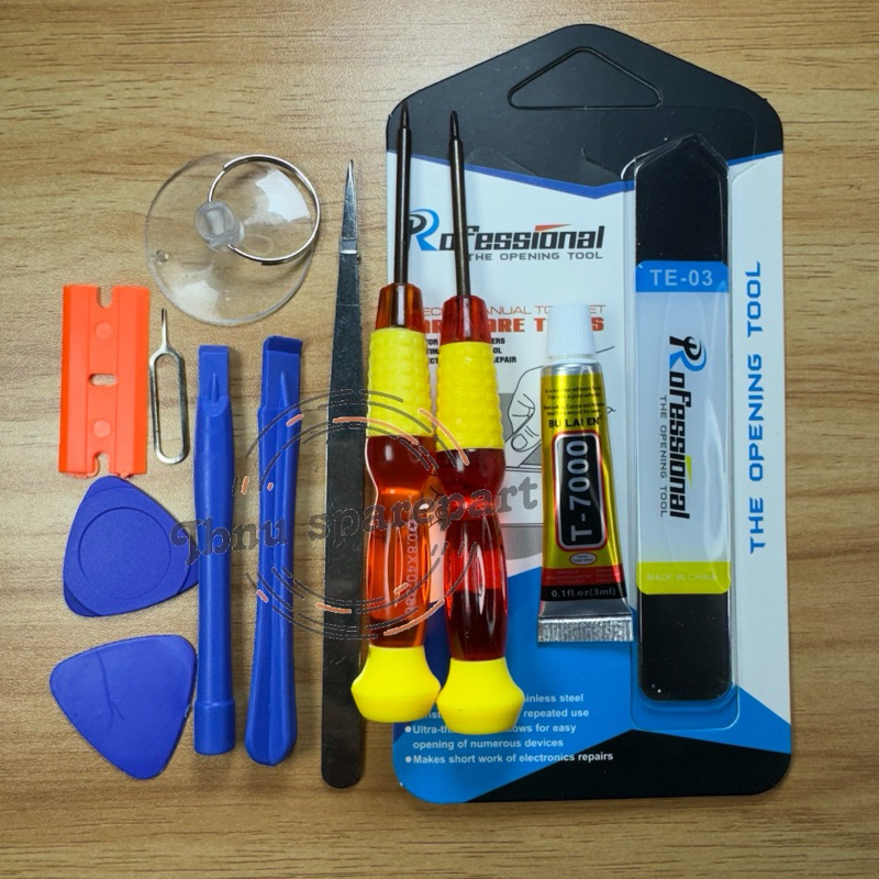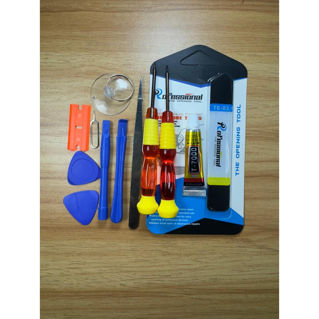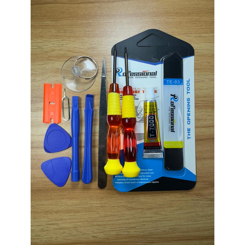 OBENG SET HP 10 IN 1 + LEM GS000 3ML (isi hitam) + ALAT PEMBUKA / PENCUNGIL LCD TOUCHSCREEN TE-03 OPENING TOOLS ALAT SERVIS HP