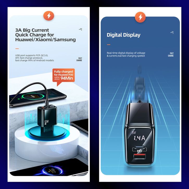 USAMS T40 Adaptor Kepala Charger Fast Charge Digital Display PD20W QC3.0