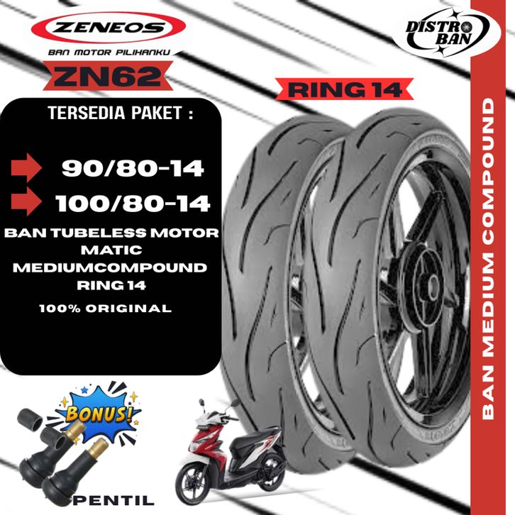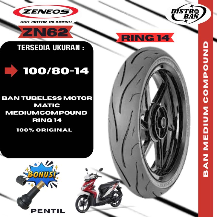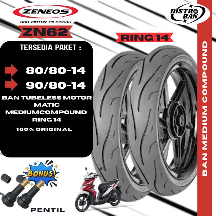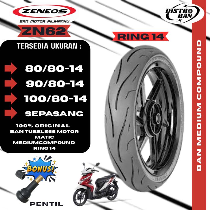 BAN MOTOR MATIC ZENEOS ZN62 RING 14 80/80 90/80 100/80 TUBELESS FREE PENTIL BUAT BEAT VARIO MIO.