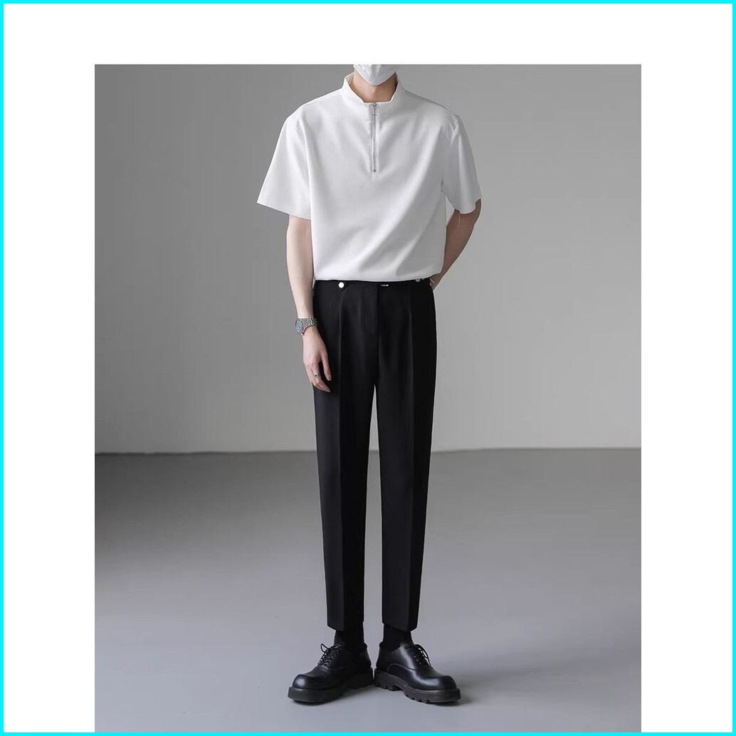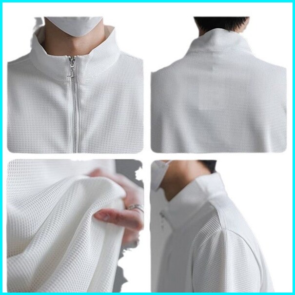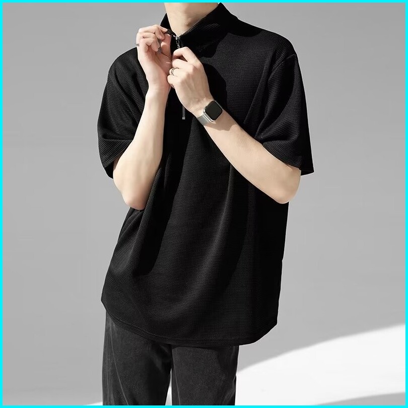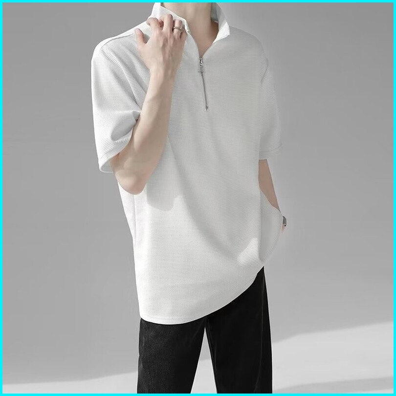 Waffle Zip Short Sleeve Polo Shirt Zip Bentuk Biasa Bukan Zip Bentuk Plus Casual Streetwear In Black And White Color - K
